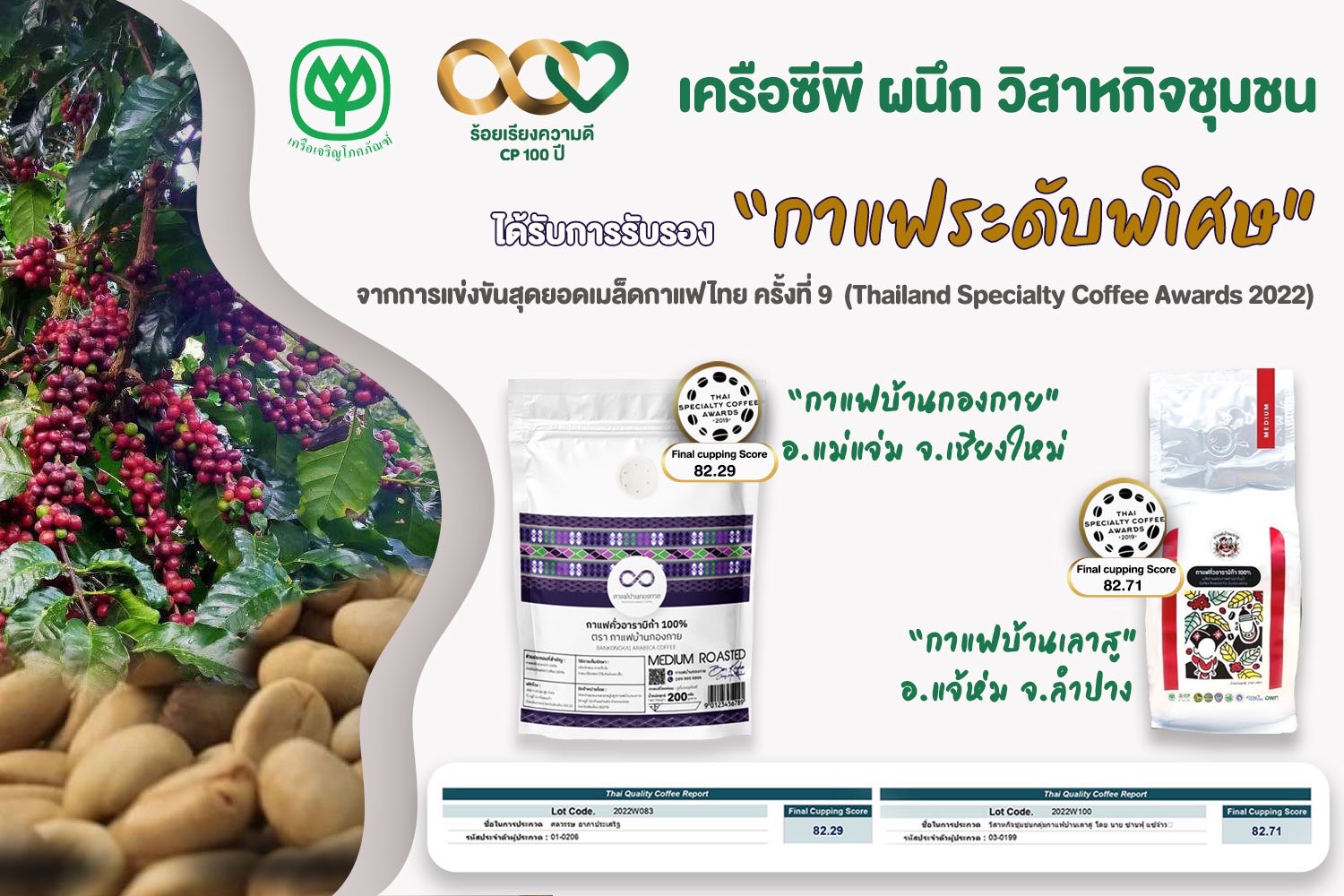 เมื่อเร็วๆนี้ หน่วยงานด้านพัฒนาความยั่งยืนภาครัฐ สํานักบริหารความยั่งยืนธรรมาภิบาล และสื่อสารองค์กร เครือเจริญโภคภัณฑ์ ได้สนับสนุนกลุ่มวิสาหกิจชุมชนภาคเหนือ ในการเข้าร่วมประกวดในงานสุดยอดเมล็ดกาแฟพิเศษไทย ครั้งที่ 9 (Thai Specialty Coffee Awards 2022) โดยผลปรากฏว่า ได้รับใบประกาศเกียรติคุณและใบรับรองผลคะแนนคุณภาพเมล็ดกาแฟจัดอยู่ในกาแฟระดับพิเศษในประเภทการแปรรูปแบบเปียก จำนวน 2 โครงการ ได้แก่ โครงการ Social Enterprise กาแฟบ้านเลาสู ผู้พิทักษ์ต้นน้ำวัง จ.ลำปาง ด้วยผลคะแนน 82.71 และโครงการกองกายหมู่บ้านฟื้นป่า 100% ศาสตร์พระราชาพัฒนาสู่ความยั่งยืน อ.เเม่เเจ่ม จ.เชียงใหม่ ด้วยผลคะแนน 82.29 จากการคัดเลือกทั่วประเทศ เพื่อส่งเสริมและผลักดันธุรกิจกาแฟไทยของเกษตรกรในโครงการ ให้เกิดการเพิ่มมูลค่าและเติบโตในตลาดกาแฟทั้งในประเทศไทย และต่างประเทศ ซึ่งโครงการดังกล่าวฯ นับเป็นหนึ่งในแผนงานยุทธศาสตร์ขับเคลื่อนงานด้านความยั่งยืน 4 ต้นน้ำภาคเหนือ ปิง วัง ยม น่าน ของเครือซีพี ที่สอดรับตามนโยบายเศรษฐกิจใหม่ (BCG Economy) เศรษฐกิจสีเขียว (Green Economy) ซึ่งเป็นการพัฒนาเศรษฐกิจที่ควบคู่ไปกับการพัฒนาสังคม และการรักษาสิ่งแวดล้อมไปพร้อมกัน