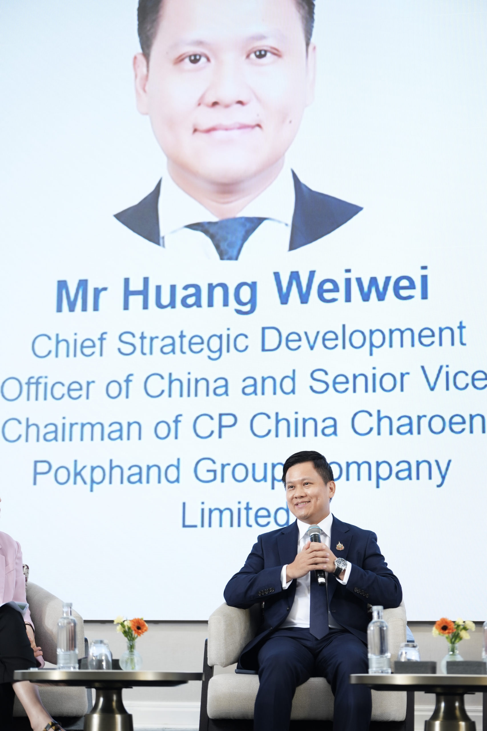 ในการนี้ คุณหวง เหวยเหว่ย ประธานด้านพัฒนากลยุทธ์และความร่วมมือกับประเทศจีน รองประธานอาวุโสเขตประเทศจีนเครือเจริญโภคภัณฑ์ ได้รับเกียรติเป็นผู้แทนจากเครือเจริญโภคภัณฑ์ ร่วมแลกเปลี่ยนวิสัยทัศน์ บนเวทีเสวนาหัวข้อ Hong Kong-Thailand Partnerships for Sustainability and Innovation โดย คุณหวง เหวยเหว่ย กล่าวว่าเครือเจริญโภคภัณฑ์ ให้ความสำคัญกับการพัฒนาแบบยั่งยืนเป็นอย่างมาก และได้ตั้งเป้า Carbon neutral ภายในปี 2030 และ Net zero ภายในปี 2050 อีกทั้งได้แบ่งปันประสบการณ์ด้านการลงทุนในประเทศจีน พร้อมชี้ให้เห็นว่าแพลตฟอร์มเงินทุนและบริการระดับมืออาชีพของฮ่องกงได้มีบทบาทสำคัญต่อการดำเนินธุรกิจในจีนและการค้าระหว่างประเทศของเครือฯ ส่วนตลาดจีนเป็นโอกาสสำหรับผู้ประกอบการไทย ทั้งความแน่นอน ขนาดของตลาด เทคโนโลยี บุคลากร และ ความสัมพันธ์ที่แน่นแฟ้นระหว่างไทยกับจีน จึงทำให้ฮ่องกง สามารถเป็นสปริงบอร์ดเพื่อเข้าสู่ตลาดจีนและแสวงหาคู่ภาคีบริษัทจีนเพื่อเข้าสู่ตลาดภูมิภาคและขยายตัวสู่ตลาดโลก สุดท้ายยืนยันความมั่นใจต่อศักยภาพเศรษฐกิจจีนและความแน่วแน่ในการพัฒนาธุรกิจในจีน
