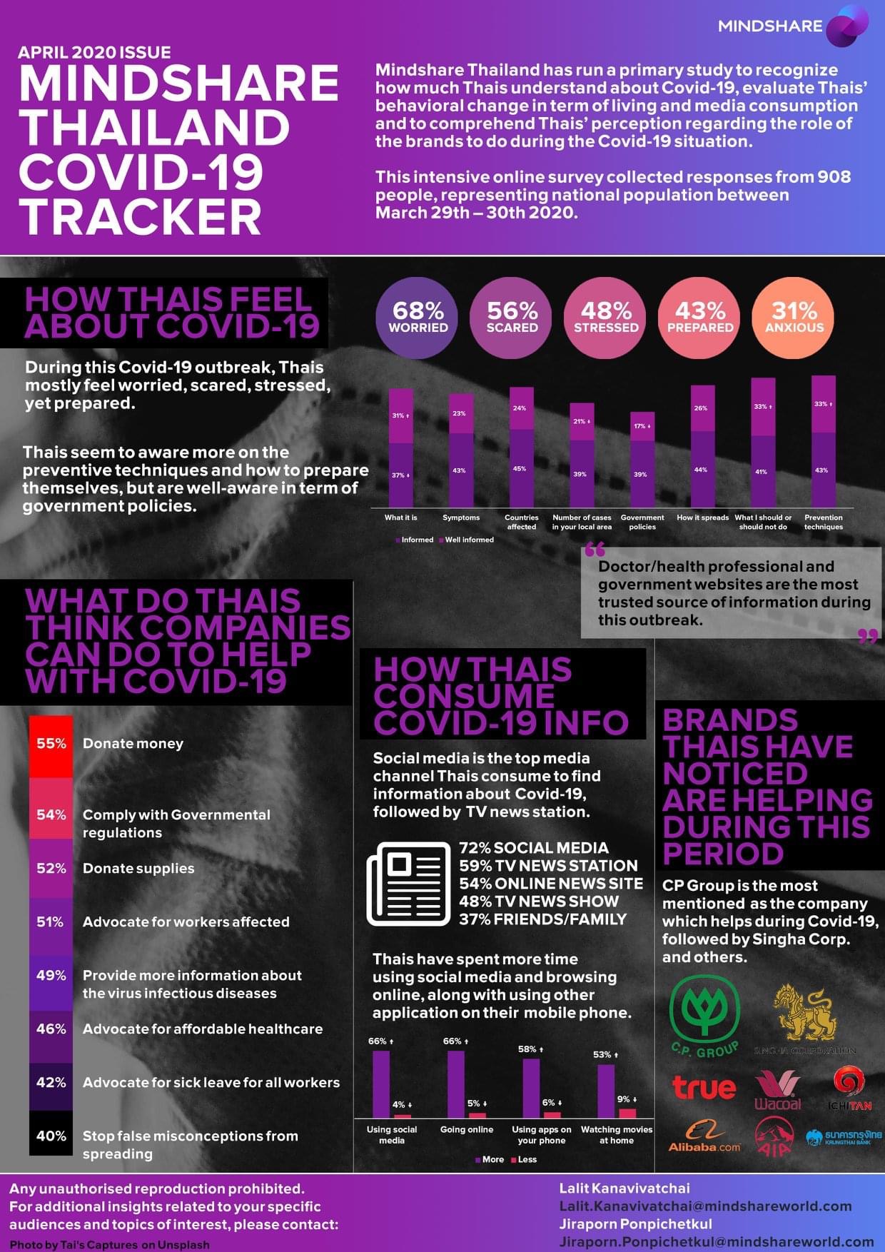 การสำรวจพบว่า ผู้บริโภคไทยถึง 68% มีความวิตกกังวลอย่างมากต่อวิกฤตการระบาดของ Coronavirus แต่ในขณะเดียวกันก็มีการตระหนักถึงการป้องกัน และเตรียมความพร้อมต่อสถานการณ์ พร้อมกันนั้นก็ยังมีความเข้าใจในยโยบายของภาครัฐเป็นอย่างดี โดยคนไทย 72% ใช้โซเชียลมีเดียเป็นช่องทางการเข้าถึงข่าวสารเกี่ยวกับ COVID-19 ส่วนรายการข่าวบนสื่อโทรทัศน์ (59%) และข่าวทางเว็บไซต์ออนไลน์ต่างๆ (54%) เป็นสื่อที่ใช้หาข้อมูลรองลงมา นอกจากนี้ยังพบว่า 66% ของผู้บริโภคหันไปใช้ชีวิตบนโลกออนไลน์มากขึ้น โดยเฉพาะในสื่อโซเชียลมีเดียและแอปพลิเคชันอื่นๆบนมือถือ