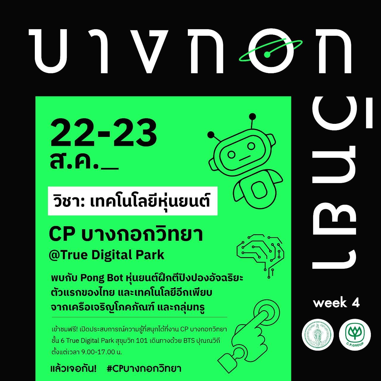 พบกันที่ งาน “CP บางกอกวิทยา” วันที่ 22-23 สิงหาคม 2565 เวลา 9.00 – 17.00 น. ณ ชั้น 6 อาคารเพกาซัส ทรู ดิจิทัล พาร์ค สุขุมวิท 101/1 (BTS สถานีปุณณวิถี) ดูรายละเอียดกิจกรรมเพิ่มเติมได้ที่ CP บางกอกวิทยา @True Digital Park
