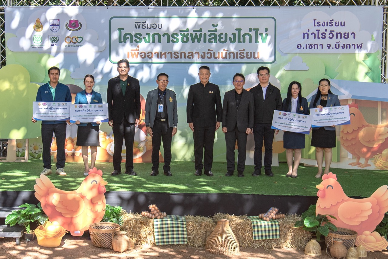 วันที่ 18 ธันวาคม 2568 – มูลนิธิเจริญโภคภัณฑ์พัฒนาชีวิตชนบท (ซีพี) เดินหน้าสานต่อเจตนารมณ์ในการส่งเสริมคุณภาพชีวิตเด็กนักเรียนในพื้นที่ห่างไกล โดยผนึกกำลังกับจังหวัดบึงกาฬ จัด “พิธีมอบและเปิดโครงการซีพีเลี้ยงไก่ไข่เพื่ออาหารกลางวันนักเรียน” โดยได้รับเกียรติจาก นายสมหวัง อารีย์เอื้อ รองผู้ว่าราชการจังหวัดบึงกาฬ เป็นประธานในพิธี โดยมี นายฮิโรชิ คาคิอุจิ รองประธานหอการค้าญี่ปุ่น-กรุงเทพฯ (JCC) ดร.วรรณที ศรีโนนยาง ผู้อำนวยการ สำนักงานเขตพื้นที่การศึกษาประถมศึกษาบึงกาฬ คุณกฤตยรัฐ ปารมี ผู้ช่วยเลขาธิการมูลนิธิเจริญโภคภัณฑ์พัฒนาชีวิตชนบท ร่วมเป็นสักขีพยานและมอบโครงการฯ ให้แก่ 4 โรงเรียน ได้แก่ โรงเรียนท่าไร่วิทยา อ.เซกา จ.บึงกาฬ, , โรงเรียนบ้านโนนสูงสุขสมบูรณ์ อ.เซกา จ.บึงกาฬ, โรงเรียนบ้านนางัวสายปัญญา อ.เซกา จ.บึงกาฬ และโรงเรียนวัดหนองเสือ (เรืองวิทยานุกูล) อ.เมือง จ.นครปฐม เพื่อขยายผลโครงการฯ ส่งมอบโภชนาการที่ดีให้แก่เด็กและเยาวชนในถิ่นทุรกันดาร งานจัดขึ้น ณ โรงเรียนท่าไร่วิทยา จังหวัดบึงกาฬ
