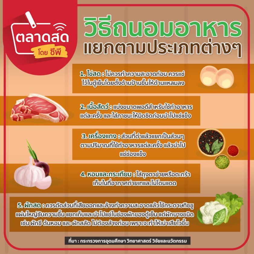 ‘ตลาดสด โดย ซีพี’ เผยเคล็ดลับวิธีถนอมอาหาร ใช้ได้จริงและมีประโยชน์ เพื่อสุขภาพที่ดี 19 มกราคม 2565SystemNews, กิจกรรมเพื่อสังคม ไข่สด : ไม่ควรทำความสะอาดก่อน ควรแช่ ไว้ในตู้เย็นโดยตั้งด้านป้านขึ้นให้ด้านแหลมลง เนื้อสัตว์ : แบ่งขนาดพอดีสำหรับใช้ทำอาหาร แต่ละครั้ง และใส่ภาชนะให้มิดชิดก่อนนำไปแช่แข็ง เครื่องแกง : ส่วนที่ตำแล้วแยกเป็นส่วนๆ ตามปริมาณที่ใช้ทำอาหารแต่ละครั้ง แล้วนำไง แช่ช่องแข็ง หอมและกระเทียม : ใส่ถุงตาข่ายหรือตะกร้า เก็บในที่อากาศถ่ายเทและไม่โดนแดด ผักสด : ควรตัดส่วนที่เสียออกและล้างทำความสะอาดแล้วใช้กระดาษทิชชูแผ่นใหญ่ชับความชื้น แยกเก็บและนำไปแช่ในช่องผักของตู้เย็น Cr.PR CPF Post Views: 1,031