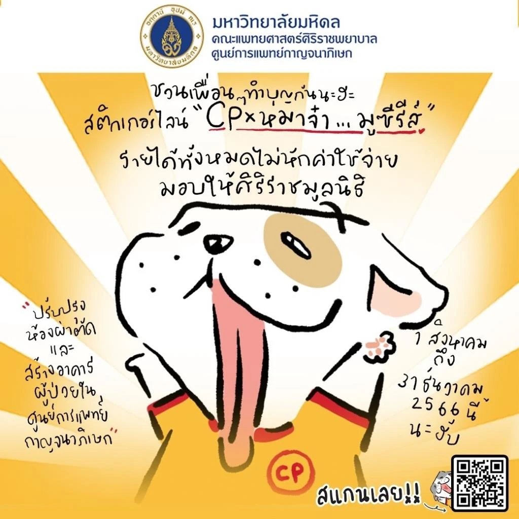 สำหรับผู้สนใจสามารถดาวน์โหลด Sticker Line ได้จากโทรศัพท์มือถือ ทั้งระบบปฏิบัติการ iOS และ Android เพียงพิมพ์คำว่า “CP x หมาจ๋า….มูซีรีส์” ตั้งแต่วันนี้-31 ธันวาคม 2566 ในราคาเพียง 35 บาท (50 Coins) เท่านั้น สามารถร่วมทำบุญได้ทันที ไม่ว่าจะโหลดใช้เองหรือส่งต่อเป็นของขวัญสุดพิเศษให้คนที่คุณรัก โดยสแกน QR Code หรือ คลิก >> https://store.line.me/stickershop/product/23853577/ เพียงเท่านี้! ผู้รับก็อิ่มใจและผู้ส่งก็ยังอิ่มบุญ ติดตามข้อมูลศูนย์การแพทย์กาญจนาภิเษก เพิ่มเติมได้ที่ https://www.facebook.com/gj.mahidol?mibextid=LQQJ4d