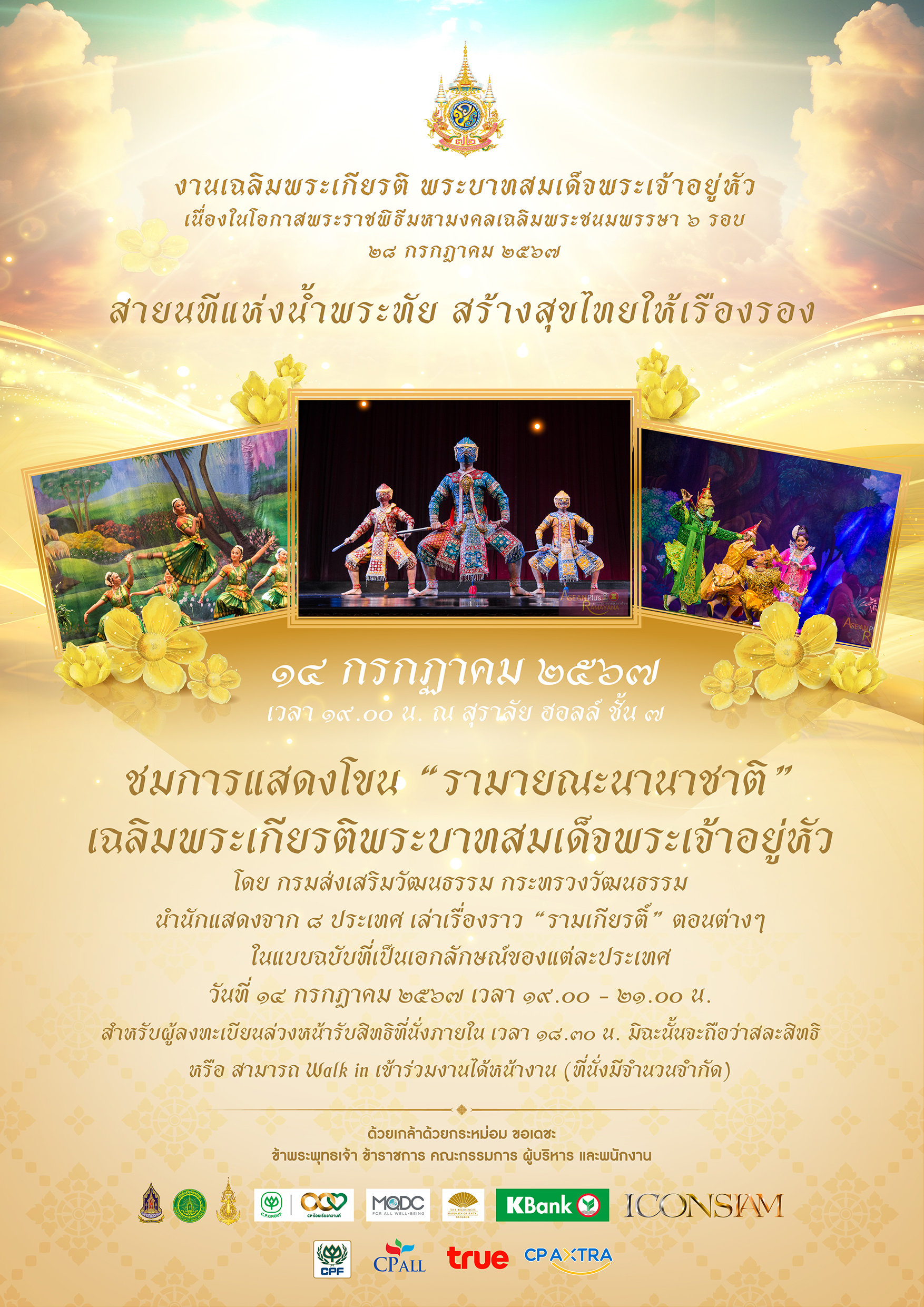 นายณรงค์ เจียรวนนท์ รองประธานอาวุโส เครือเจริญโภคภัณฑ์ เปิดเผยว่า เนื่องในโอกาสพระราชพิธีมหามงคลเฉลิมพระชนมพรรษา 72 พรรษา 28 กรกฎาคม 2567 นับเป็นปีมหามงคลยิ่งของปวงชนชาวไทย เครือเจริญโภคภัณฑ์ (ซีพี) ภาคภูมิใจที่ได้สนับสนุนไอคอนสยามในการจัดงานเฉลิมพระเกียรติพระบาทสมเด็จพระเจ้าอยู่หัวเพื่อแสดงความจงรักภักดีและสำนึกในพระมหากรุณาธิคุณที่ทรงมีต่อศิลปวัฒนธรรมของชาติ ร่วมกับ ไอคอนสยาม ในงาน “เทศกาลการแสดงรามายณะนานาชาติเฉลิมพระเกียรติพระบาทสมเด็จพระเจ้าอยู่หัว” ซึ่งดำเนินการโดยกรมส่งเสริมวัฒนธรรม กระทรวงวัฒนธรรม นำนักแสดงจาก 8 ประเทศ ประกอบด้วย สาธารณรัฐอินเดีย ราชอาณาจักรกัมพูชา สาธารณรัฐแห่งสหภาพเมียนมา สาธารณรัฐสิงคโปร์ สาธารณรัฐฟิลิปปินส์ สาธารณรัฐอินโดนีเซีย สหพันธรัฐมาเลเซีย และประเทศไทย เผยแพร่มรดกภูมิปัญญาทางวัฒนธรรมด้านศิลปะการแสดงเรื่อง รามายณะ หรือ รามเกียรติ์ อันเป็นวรรณกรรมที่มีรากฐานมาจากมหากาพย์รามายณะของอินเดีย และเป็นมรดกทางวัฒนธรรมร่วมกันของอาเซียน ผ่านการแสดงอันวิจิตรงดงาม ตระการตา และยิ่งใหญ่สมพระเกียรติ สะท้อนถึงเอกลักษณ์และอัตลักษณ์ของแต่ละชาติที่จะถ่ายทอดออกมาตามเนื้อเรื่องรามายณะในแต่ละตอน เพื่อให้ประชาชนชาวไทยได้เรียนรู้ศิลปะการแสดงของแต่ละประเทศและร่วมสืบสาน รักษา ต่อยอด ในงานศิลปะการแสดงโขนของไทย เปิดให้เข้าชมโดยไม่มีค่าใช้จ่าย ในวันอาทิตย์ที่ 14 กรกฎาคม เวลา 19.00 น. ณ สุราลัย ฮอลล์ ชั้น 7 ไอคอนสยาม โดยสามารถลงทะเบียนเข้าชมได้ที่ https://bit.ly/45RyATs หรือสอบถามข้อมูลเพิ่มเติมโทร. 1338