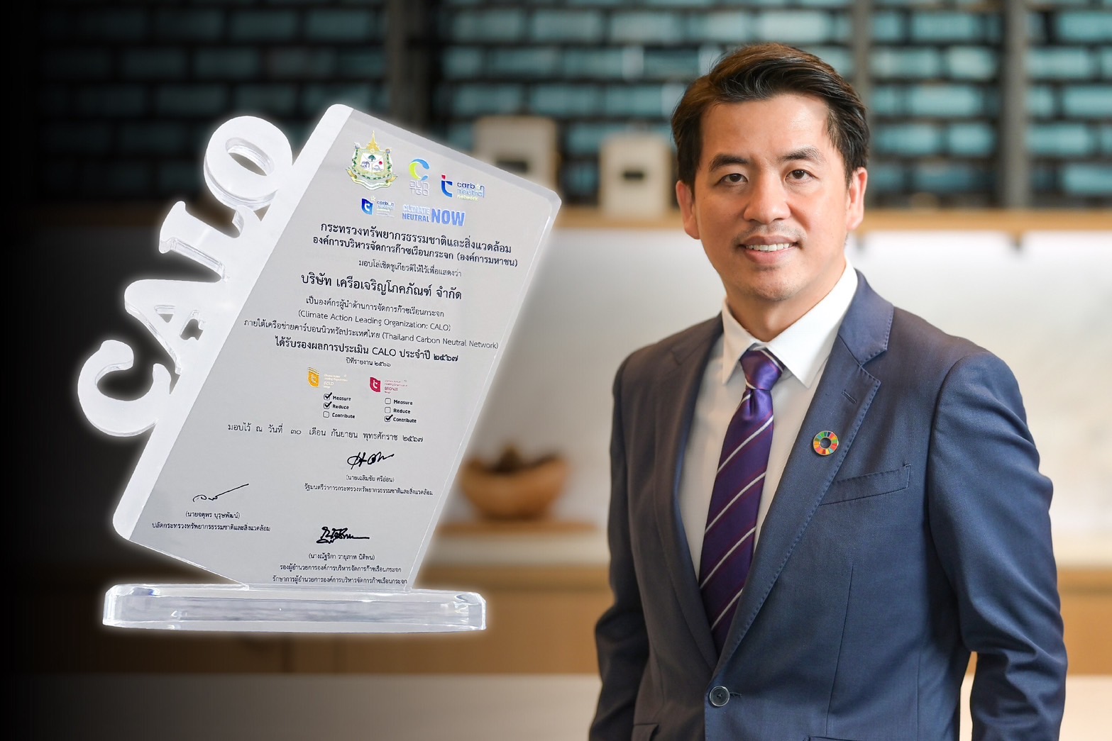 30 กันยายน 2567 – เครือเจริญโภคภัณฑ์ (ซีพี) และบริษัทในเครือ ประกอบด้วย บมจ.ทรู คอร์ปอเรชั่น และ บมจ.เจริญโภคภัณฑ์อาหาร (ซีพีเอฟ) ได้รับโล่ประกาศเกียรติคุณ “องค์กรผู้นำด้านการจัดการก๊าซเรือนกระจก” ประจำปี 2567 จากองค์การบริหารจัดการก๊าซเรือนกระจก (อบก.) และเครือข่ายคาร์บอนนิวทรัลประเทศไทย (TCNN) โดยเครือซีพีและทรูได้รับการยกย่องในระดับยอดเยี่ยม ส่วนซีพีเอฟได้รับการประเมินในระดับดีเด่น นับเป็นก้าวสำคัญสู่เป้าหมายการพัฒนาอย่างยั่งยืนและการลดโลกร้อนของเครือฯ ที่ได้รับการยกย่องจากผลงานที่ชัดเจนและเป็นรูปธรรมในด้านการบริหารจัดการก๊าซเรือนกระจก ตอกย้ำความมุ่งมั่นสู่เป้าหมาย Carbon Neutral ในปี 2030 และ Net Zero ในปี 2050