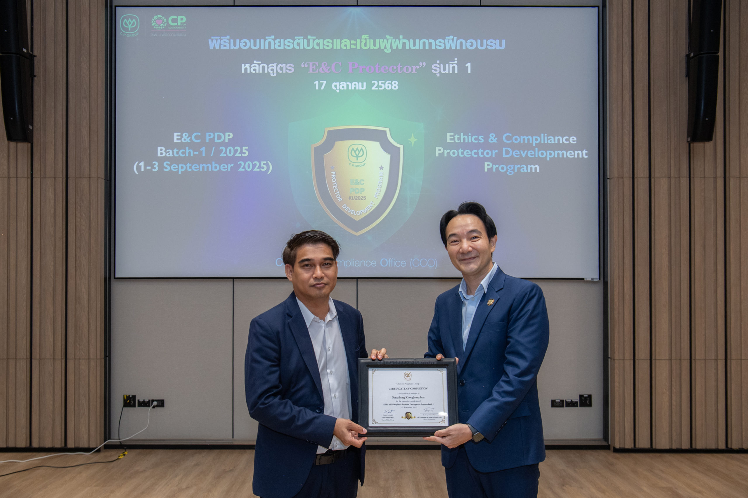 จากนั้นเป็นพิธีมอบเกียรติบัตรแก่ผู้สำเร็จหลักสูตร E&C PDP รุ่นที่ 1 ประจำปี 2025 โดยมี คุณวรวิทย์ วรุตบางกูร หัวหน้าคณะผู้บริหารด้านกำกับการปฏิบัติตามกฎเกณฑ์ เป็นประธานมอบเกียรติบัตรให้แก่ผู้ผ่านการอบรม ภายใต้แนวคิด “Protector – ผู้พิทักษ์แห่งความถูกต้อง” ซึ่งหลักสูตรดังกล่าวจัดขึ้นโดย สำนักกำกับการปฏิบัติตามกฎเกณฑ์ ร่วมกับ สถาบันผู้นำเครือเจริญโภคภัณฑ์ เพื่อเสริมสร้างองค์ความรู้ด้านจริยธรรม การบริหารความเสี่ยง และการกำกับดูแลกิจการอย่างยั่งยืน ให้แก่ผู้บริหารด้าน Compliance จาก 24 กลุ่มธุรกิจในประเทศไทย และ 43 เขตธุรกิจในประเทศจีน โดยเปิดโอกาสให้ผู้เข้าร่วมได้แลกเปลี่ยนมุมมองและประสบการณ์ร่วมกัน ระหว่างวันที่ 1–3 กันยายน 2568 ณ สถาบันผู้นำเครือเจริญโภคภัณฑ์