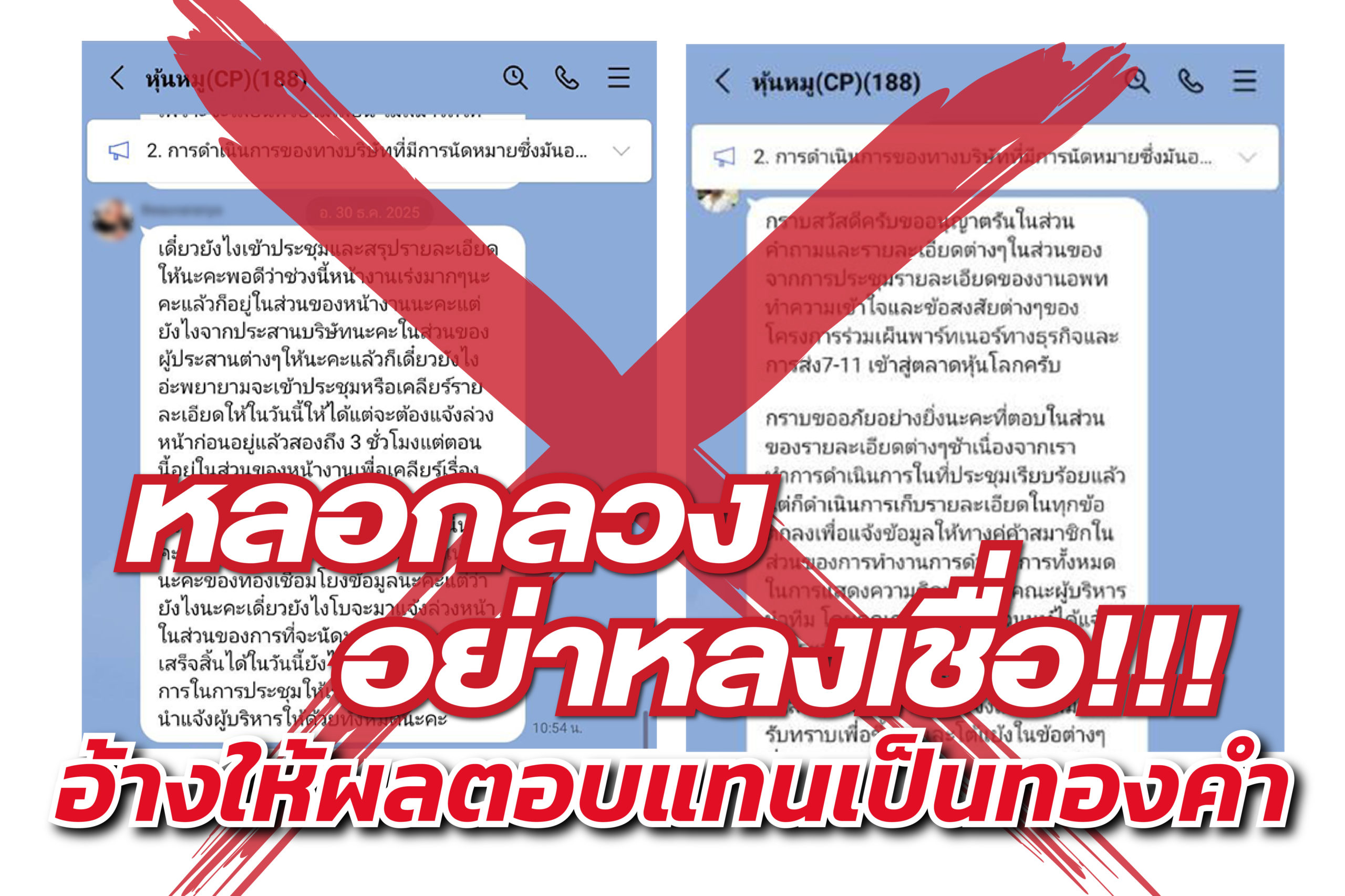 นอกจากนี้ เครือเจริญโภคภัณฑ์ ไม่มีนโยบายชักชวนประชาชนลงทุนผ่านช่องทางส่วนบุคคล กลุ่มไลน์ หรือการรับผลตอบแทนในรูปแบบทองคำหรือเงินสด และการดำเนินโครงการหรือการลงทุนใด ๆ ของเครือฯ จะสื่อสารผ่านช่องทางทางการของบริษัทเท่านั้น