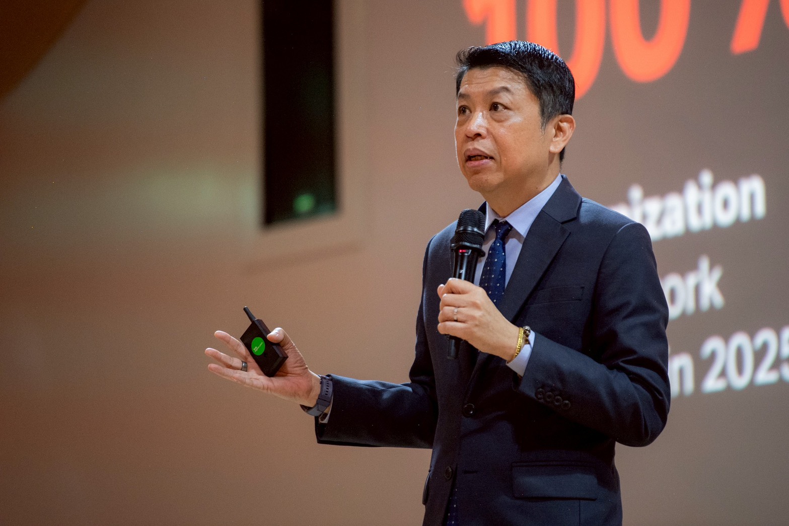 คุณเอกราช ปัญจวีณิน หัวหน้าคณะผู้บริหารด้านดิจิทัล บมจ. ทรู คอร์ปอเรชั่น และกรรมการผู้จัดการใหญ่ ทรู ดิจิทัล กรุ๊ป ร่วมถ่ายทอดวิสัยทัศน์ในหัวข้อ “การปรับตัวเพื่อก้าวเข้าสู่ยุค Digital Reinvention ด้วยเทคโนโลยียุคใหม่” โดยชี้ว่า โลกได้ก้าวข้ามจากยุค Digital Transformation สู่ยุค “Digital Reinvention” อย่างเต็มรูปแบบ ซึ่งเทคโนโลยีไม่ได้เป็นเพียงเครื่องมือสนับสนุนอีกต่อไป แต่กลายเป็นแกนกลางของการดำเนินธุรกิจและวิถีชีวิต สะท้อนผ่านการเติบโตของเศรษฐกิจดิจิทัลไทยที่มีมูลค่าการใช้จ่ายด้านเทคโนโลยีทะลุ 1 ล้านล้านบาทเป็นครั้งแรก และกว่า 63% เป็นการลงทุนในเทคโนโลยียุคใหม่ แสดงถึงความตื่นตัวของภาคองค์กรไทยอย่างชัดเจน