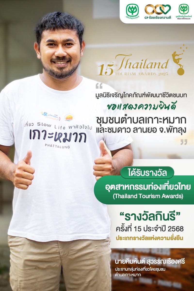 มูลนิธิซีพี ขอแสดงความยินดี ภาคีเครือข่ายชุมชนตำบลเกาะหมาก และชมดาว ลานยอ จ.พัทลุง ได้รับรางวัล “กินรีสีเขียว” ในงาน Thailand Tourism Awards 2568 ตอกย้ำความสำเร็จดันการท่องเที่ยวไทยใส่ใจสิ่งแวดล้อมอย่างยั่งยืน