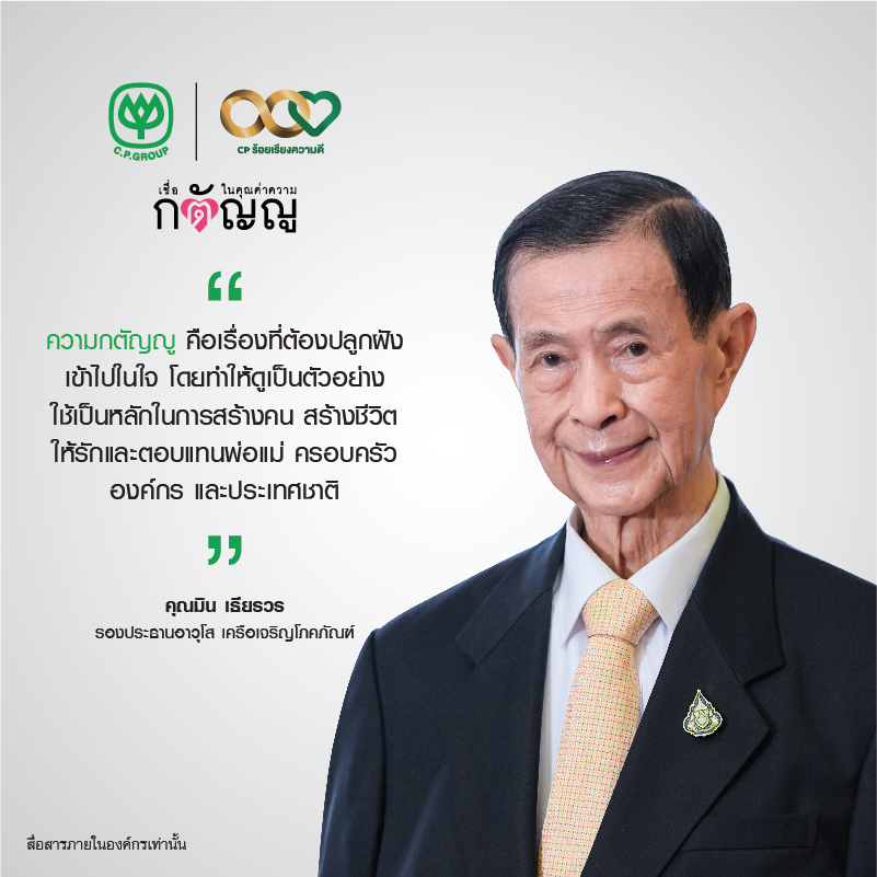 “ความกตัญญู คือเรื่องที่ต้องปลูกฝังเข้าไปในใจ โดยทำให้ดูเป็นตัวอย่าง ใช้เป็นหลักในการสร้างคนสร้างชีวิต ให้รักและตอบแทนพ่อแม่ ครอบครัว องค์กร และประเทศชาติ”