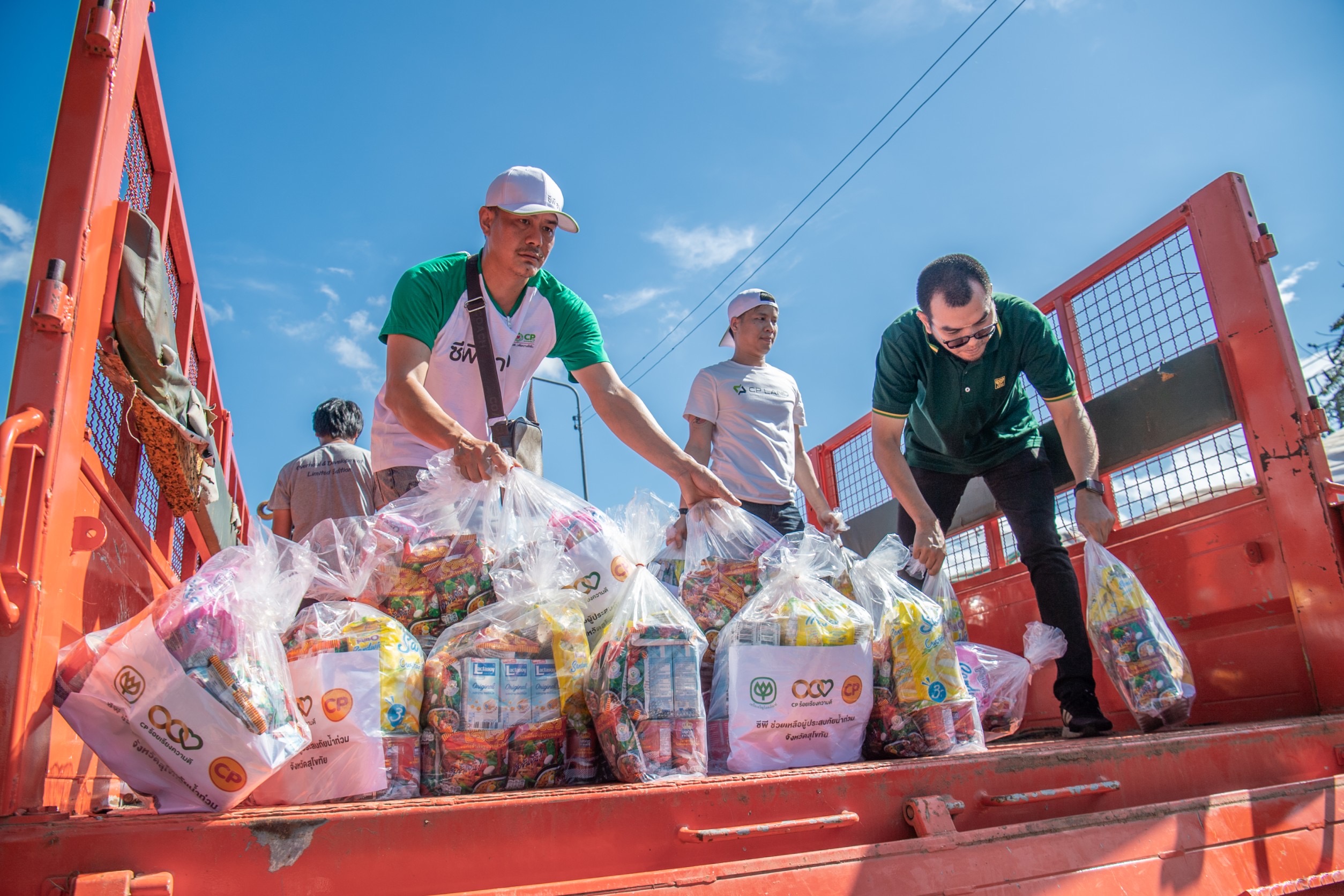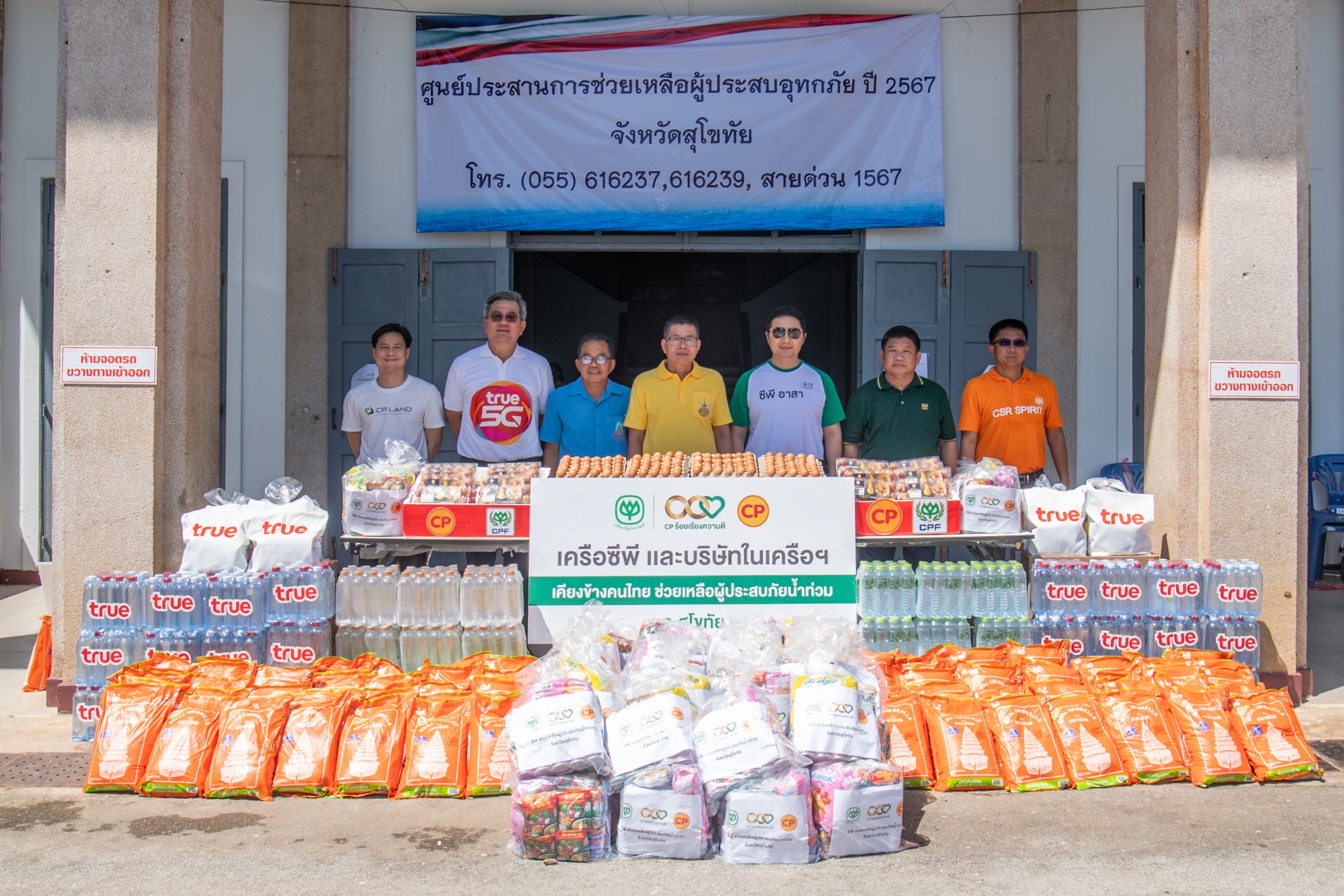 ด้าน นายจอมกิตติ ศิริกุล รองกรรมการผู้จัดการใหญ่อาวุโสด้านพัฒนาความยั่งยืนภาครัฐและกิจการสัมพันธ์ เครือเจริญโภคภัณฑ์ เปิดเผยว่า เครือเจริญโภคภัณฑ์ มีนโยบายเร่งด่วนในการช่วยเหลือผู้ประสบภัยน้ำท่วมภาคเหนือ โดยที่ผ่านมา เครือซีพีได้มอบถุงยังชีพ เครื่องอุปโภคบริโภค น้ำดื่ม อาหาร และวัตถุดิบของสดสำหรับโรงครัวเพื่อทำอาหารแจกจ่ายประชาชน ใน 2 จังหวัด ได้แก่ จ.น่าน และ จ.เชียงราย ในครั้งนี้ จ.สุโขทัย ถือเป็นอีกหนึ่งพื้นที่ที่ได้รับผลกระทบหนักจากมวลน้ำจากแม่น้ำยม น้ำไหลทะลักจนผนังปูนพังในหลายจุด เครือซีพี จึงได้ประสานร่วมกับกลุ่มบริษัทในเครือฯ ได้แก่ บมจ.เจริญโภคภัณฑ์อาหาร (CPF) บมจ.ทรู คอร์ปอเรชั่น (TRUE) บจก.ข้าวซีพี (ข้าวตราฉัตร) และบจก.ซี.พี. แลนด์ (CP Land) โดยมีการส่งมอบของช่วยเหลือ ประกอบด้วย ถุงยังชีพ วัตถุดิบของสด ไข่ไก่ซีพี ข้าวตราฉัตร น้ำดื่ม พร้อมตั้งบูธข้าวไข่เจียว และรวมถึงสนับสนุนรถโมบายสัญญาณทรู 5G ให้บริการสัญญานสื่อสาร อินเทอร์เน็ต พร้อมระดมพนักงาน “ซีพีอาสา” กว่า 40 คน ร่วมนำสิ่งของไปแจกจ่ายแก่ประชาชน ต.วังใหญ่ อ.ศรีสำโรง ที่ได้รับผลกระทบจากพนังกั้นน้ำพัง โดย เครือซีพี ยังคงเดินหน้าช่วยเหลือพี่น้องประชาชนในพื้นที่ที่ได้รับผลกระทบจากสถานการณ์น้ำท่วมอย่างต่อเนื่อง