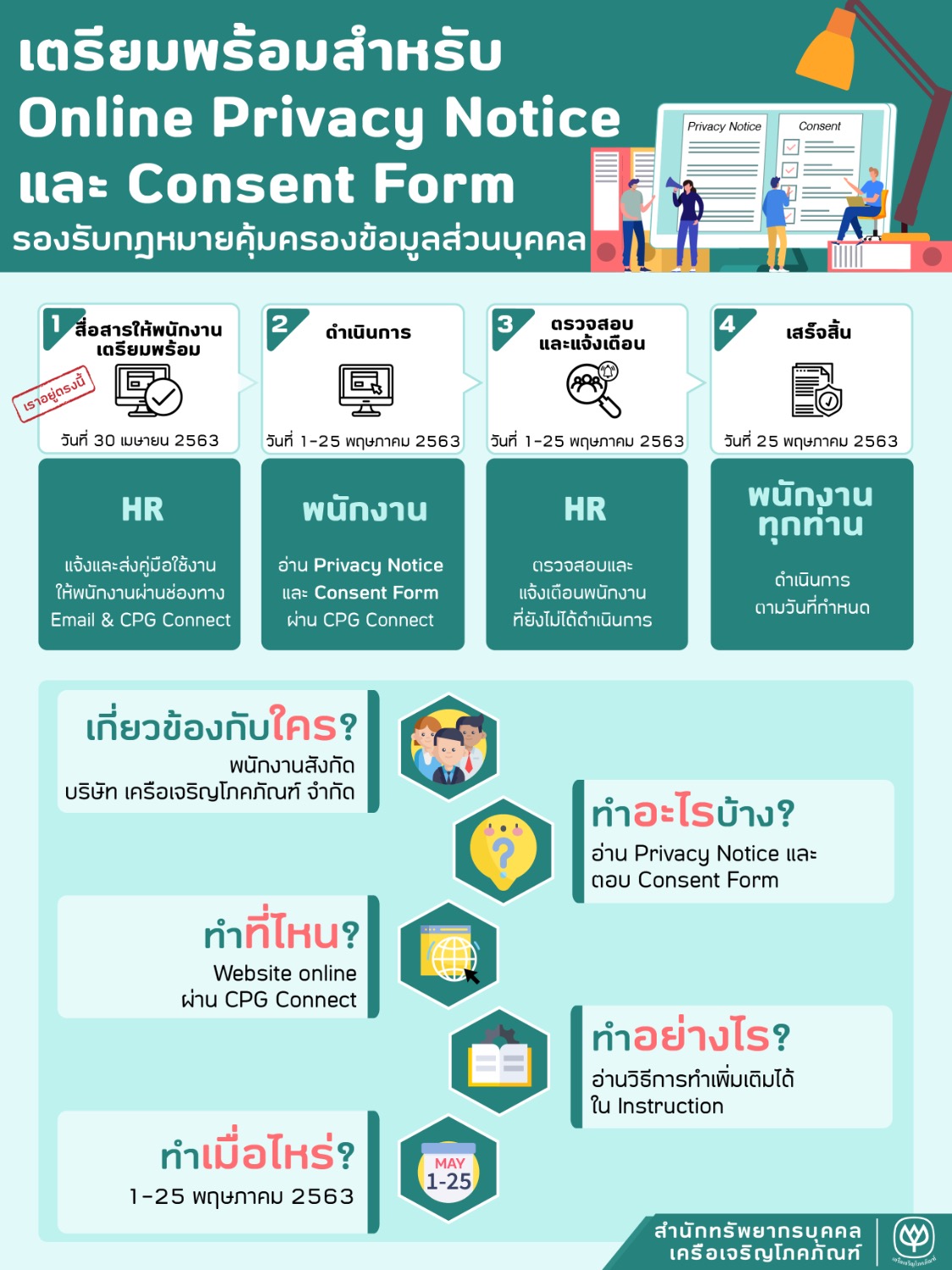 สืบเนื่องจากพรบ.ข้อมูลส่วนบุคคลจะเริ่มมีผลบังคับใช้ในวันที่ 27 พฤษภาคม 2563 สำนักทรัพยากรบุคคล เครือเจริญโภคภัณฑ์ได้แจ้งเพื่อนพนักงานเตรียมความพร้อมโดยขอความร่วมมือพนักงานทุกคน