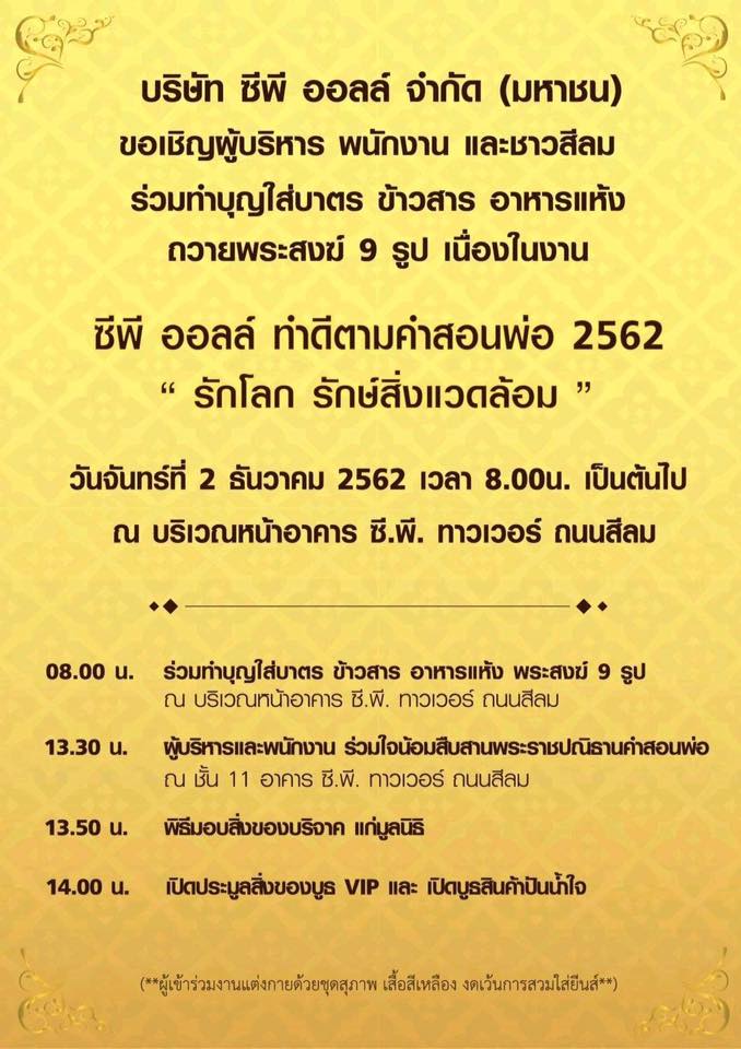 ซีพีออลล์ขอเชิญผู้บริหารและพนักงานและชาวสีลม ร่วมทำบุญใส่บาตร ข้าวสาร อาหารแห้งถวายพระสงฆ์ 9 รูป ในงาน ซีพี ออลล์ ทำดีตามคำสอนพ่อ