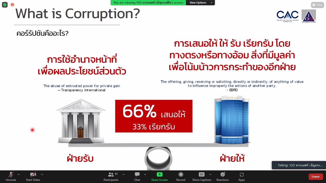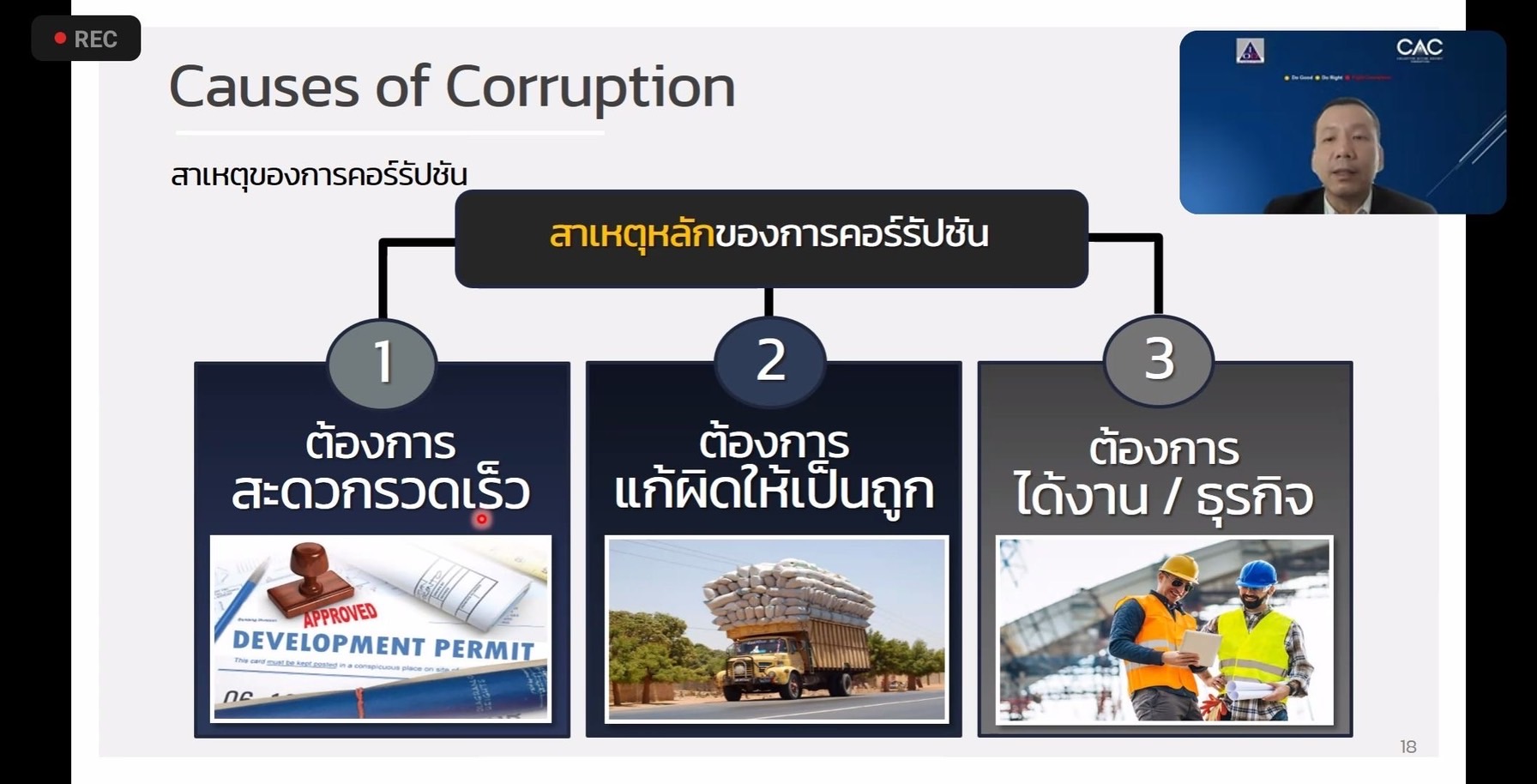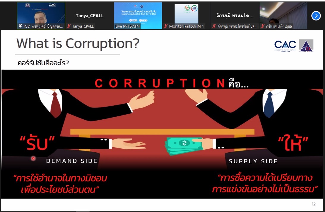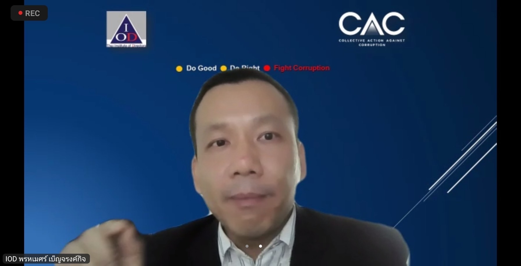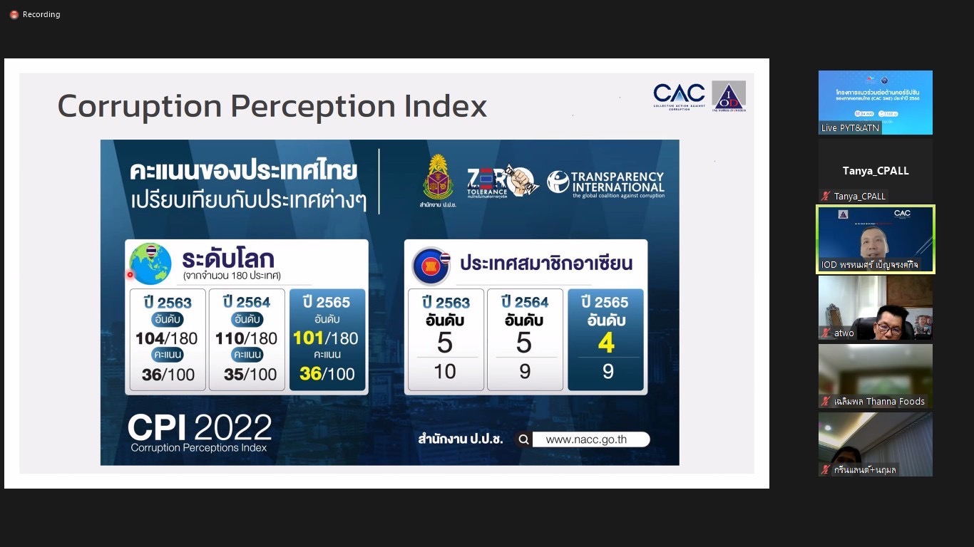 โดยผู้อำนวยการ CAC ได้นำเสนอข้อมูลที่ชวนฉุกคิด จากดัชนีการรับรู้การทุจริต (Corruption Perceptions Index: CPI) ประจำปี 2565 จัดทำโดย Transparency International (TI) มีประเทศที่ถูกจัดอันดับทั้งสิ้น 180 ประเทศ โดยประเทศเดนมาร์ก ถูกจัดให้มีคะแนนสูงสุดของโลกได้ 90 คะแนน อันดับที่ 2 ตกเป็นของประเทศฟินแลนด์ และประเทศนิวซีแลนด์ ได้คะแนน 87 คะแนนเท่ากัน ด้านประเทศไทยคะแนนดีขึ้นจากปี 2564 จาก 35 เป็น 36 คะแนน จัดอยู่ในอันดับที่ 101 ของโลก หากมองในแง่คะแนน CPI ความโปร่งใสของประเทศไทยถือได้ว่าไม่เปลี่ยนแปลงมากนัก ในช่วง 1 ทศวรรษที่ผ่านมา คะแนน CPI ของไทยมีค่าเฉลี่ยเพียง 36 คะแนน แน่นอนว่าปัญหาคอร์รัปชันของประเทศไทยไม่สามารถอาศัยกลไกภาครัฐเพียงอย่างเดียวได้ แต่ต้องมีการประสานความร่วมมือจากทุกฝ่ายที่เกี่ยวข้อง โดยเฉพาะภาคเอกชน ในการบริหารจัดการสมการคอร์รัปชันให้เกิดความโปร่งใสมากที่สุด