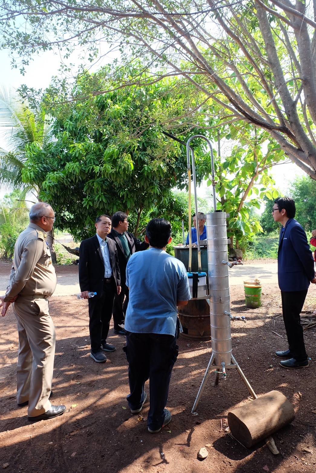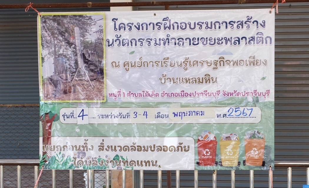 โอกาสนี้คณะทำงานได้เยี่ยมชม “ศูนย์การเรียนรู้เศรษฐกิจพอเพียงบ้านแหลมหิน” ต.ไม้เค็ด อ.เมือง จ.ปราจีนบุรี เพื่อศึกษาดูงานโครงการสร้างนวัตกรรมทำลายขยะพลาสติก โดยมีคุณน้ำค้าง เหล็กศิริ ผู้ใหญ่บ้านหมู่ที่ 1 ต.ไม้เค็ด และคณะให้การต้อนรับพร้อมถ่ายทอดความรู้เรื่องการเปลี่ยน “ขยะพลาสติก” ให้เป็น “น้ำมัน” เพื่อนำไปใช้ในกิจกรรมต่างๆ เช่น รถจักรยานยนต์ เครื่องตัดหญ้า เครื่องสูบน้ำ รวมถึงใช้เป็นเชื้อเพลิงสำหรับเตาเผาศพได้เช่นกัน โดยศูนย์ฯ แห่งนี้ถือเป็นแหล่งเรียนรู้ของชุมชนในการส่งต่อและสนับสนุนองค์ความรู้ควบคู่ไปกับการ “บูรณาการหลักสูตรท้องถิ่น” ให้ผู้ที่สนใจมีโอกาสได้เรียนรู้ร่วมกัน