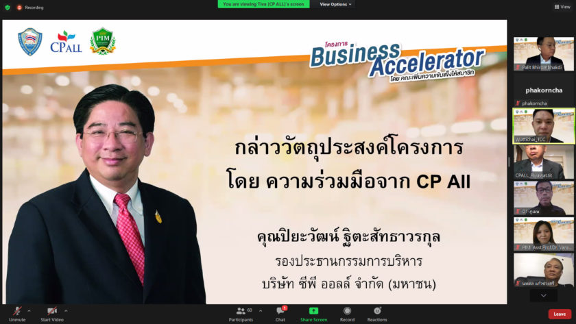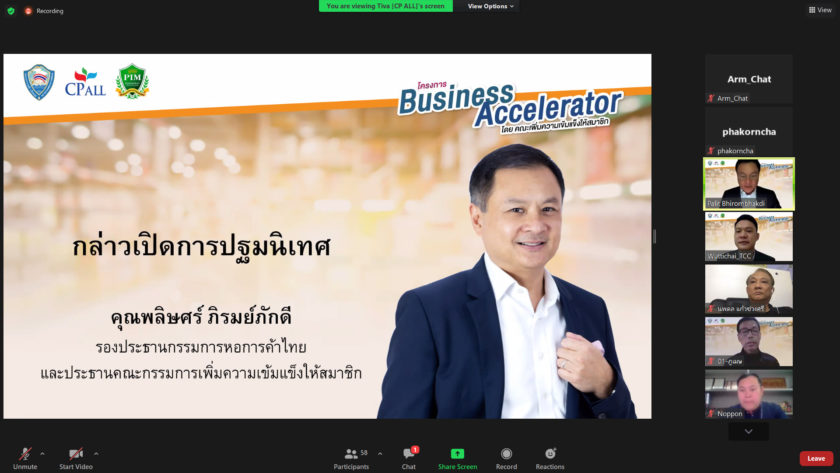 คุณพลิษศร์ ภิรมย์ภักดี รองประธานกรรมการหอการค้าไทย และประธานคณะกรรมการเพิ่มความเข้มแข็งให้สมาชิก เปิดเผยว่า โครงการ Business Accelerator เป็นโครงการภายใต้ความร่วมมือระหว่างหอการค้าไทย บริษัท ซีพี ออลล์ จํากัด (มหาชน) และ สถาบันการจัดการปัญญาภิวัฒน์ (PIM) โดยในโครงการจะมีผู้เชี่ยวชาญจากบริษัทในกลุ่มธุรกิจ Modern Trade ต่าง ๆ มาให้คำแนะนำ