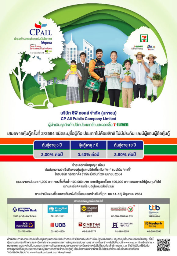 เสนอขายหุ้นกู้ 3 ชุด อายุ 5 ปี 7 ปี และ 10 ปี ให้แก่ผู้ลงทุนทั่วไป ผ่าน 10 สถาบันการเงินชั้นนำ จองซื้อขั้นต่ำ 100,000 บาท ชูอัตราดอกเบี้ยคงที่ 3.00 – 3.90% ต่อปี ทริสเรทติ้งจัดอันดับความน่าเชื่อถือหุ้นกู้ “A+” แนวโน้มอันดับเครดิต “คงที่” ![]()