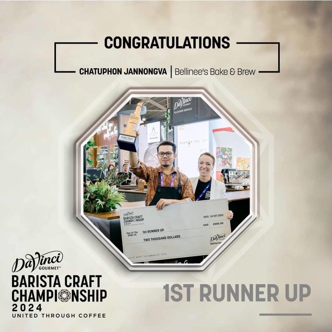 คุณจตุพล จันหนองหว้า เจ้าหน้าที่อาวุโส พัฒนาทักษะมาตรฐานกาแฟ และเครื่องดื่ม หน่วยงานคัดสรรและเบลลินี่พรีเมี่ยมคาเฟ่ ได้รับรางวัลรองชนะเลิศอันดับ 1 จากการแข่งขันระดับโลก Davinci Gourmet Barista Craft Championship 2024 ที่ประเทศสิงคโปร์ เวทีที่เกิดขึ้นเพื่อร่วมเฉลิมฉลองงานศิลปะอันประณีต งานฝีมือ และวัฒนธรรมกาแฟอันมีชีวิตชีวาที่เชื่อมโยงเราทุกคนเข้าด้วยกัน และเพื่อเฟ้นหาบาริสต้าที่มีใจรัก ในการสร้างสรรค์เมนูกาแฟชั้นเลิศ