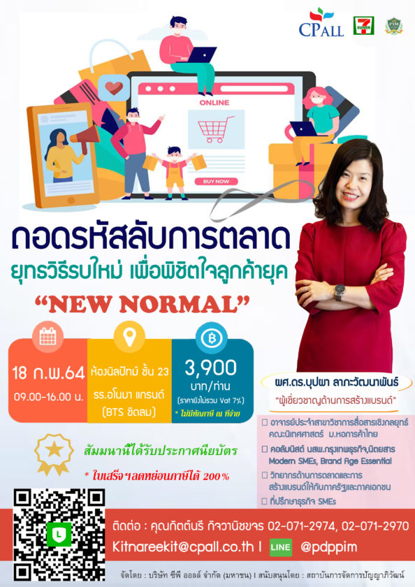 บริษัท ซีพี ออลล์ จำกัด (มหาชน) ร่วมกับ สถาบันการจัดการปัญญาภิวัฒน์ ขอเชิญเข้าร่วมสัมนาพิเศษ “ถอดรหัสลับการตลาด …ยุทธวิธีรบใหม่ เพื่อพิชิตใจลูกค้ายุค New Normal” บรรยายโดย ผู้ช่วยศาสตราจารย์ ดร.บุปผา ลาภะวัฒนาพันธ์ ผู้เชี่ยวชาญด้านการตลาดและการสร้างแบรนด์