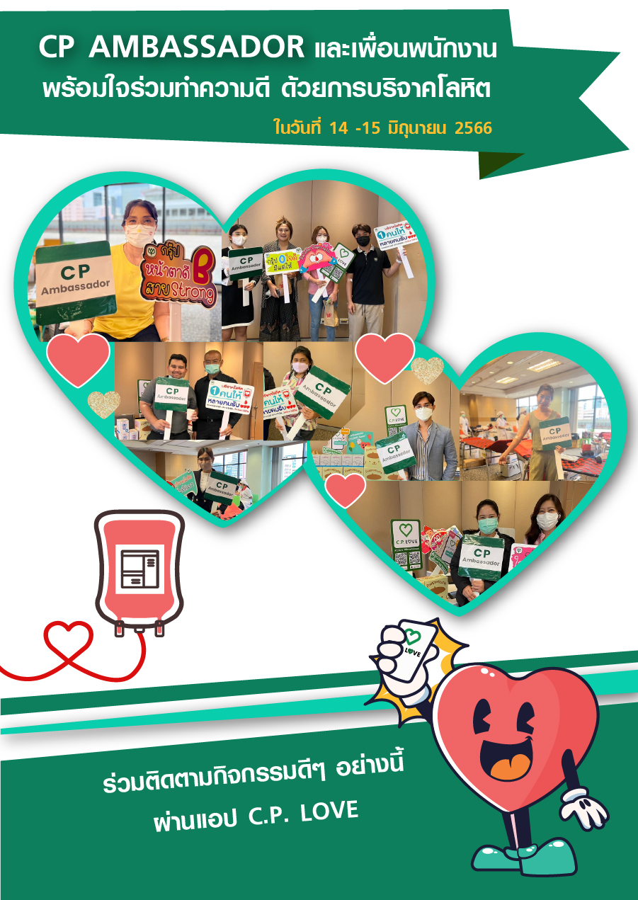 CP Ambassador และเพื่อนพนักงาน พร้อมใจร่วมทำความดี ด้วยการบริจาคโลหิตในวันที่ 14 -15 มิถุนายน 2566 ณ ห้องประชุม ชั้น 11 อาคาร ซี.พี.ทาวเวอร์ สีลม เนื่องในโอกาสวันผู้บริจาคโลหิตโลก (World Blood Donor Day) ซึ่งตรงกับวันที่ 14 มิถุนายนของทุกปี