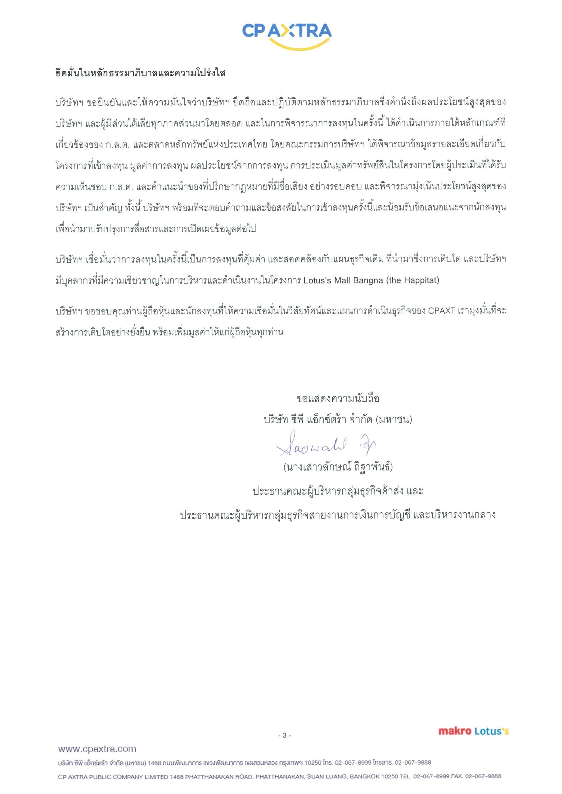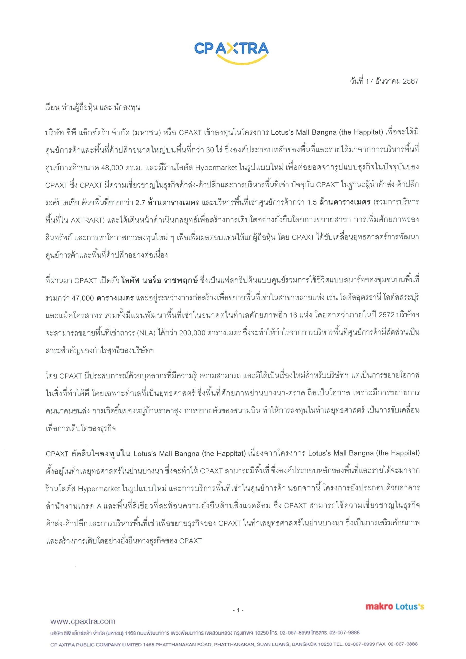 บริษัทฯ ขอขอบคุณท่านผู้ถือหุ้นและนักลงทุนที่ให้ความเชื่อมั่นในวิสัยทัศน์และแผนการดำเนินธุรกิจของ CPAXT เรามุ่งมั่นที่จะสร้างการเติบโตอย่างยั่งยืน พร้อมเพิ่มมูลค่าให้แก่ผู้ถือหุ้นทุกท่าน