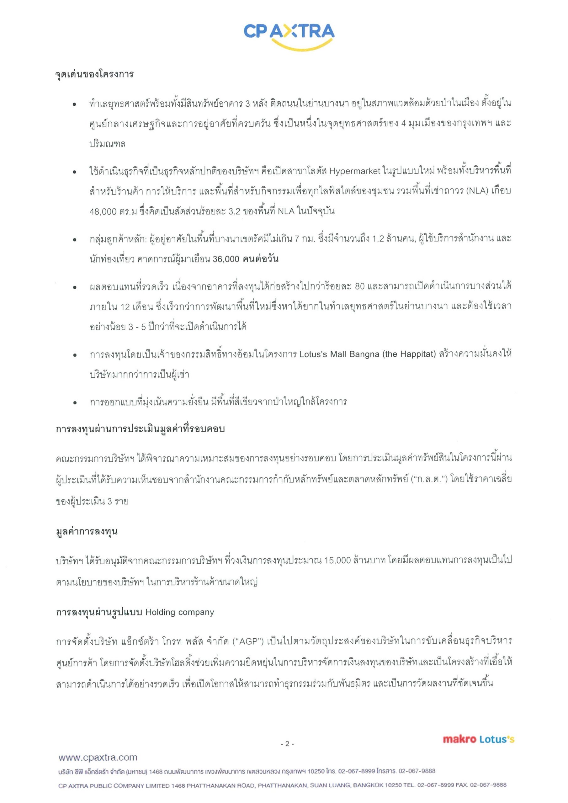 ซีพี แอ็กซ์ตร้า แจ้งนักลงทุน ย้ำแผนพัฒนา Lotus’s Mall Bangna (the Happitat) ยึดหลักธรรมาภิบาล โปร่งใส เพื่อประโยชน์สูงสุดของผู้ถือหุ้นและการเติบโตของธุรกิจ