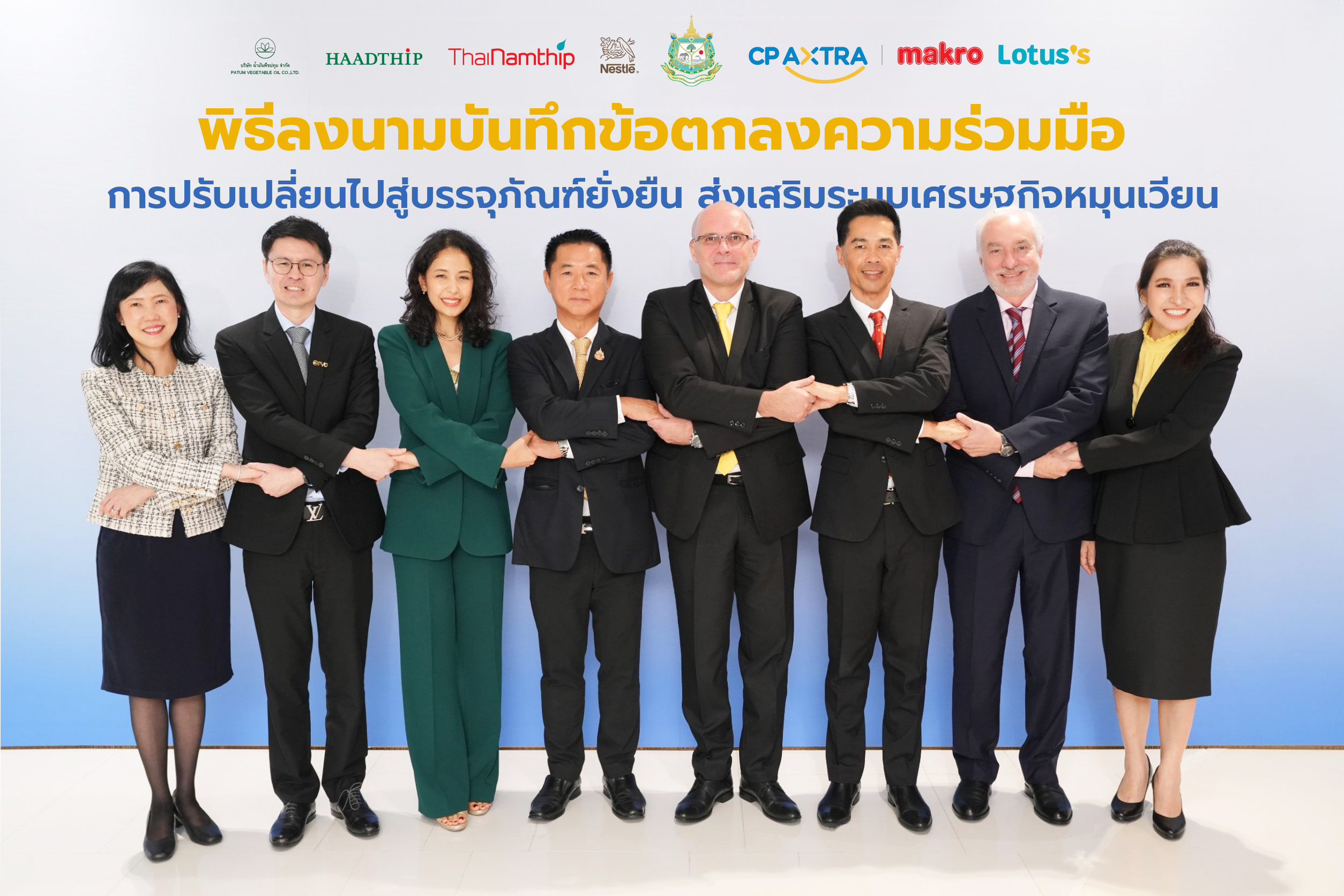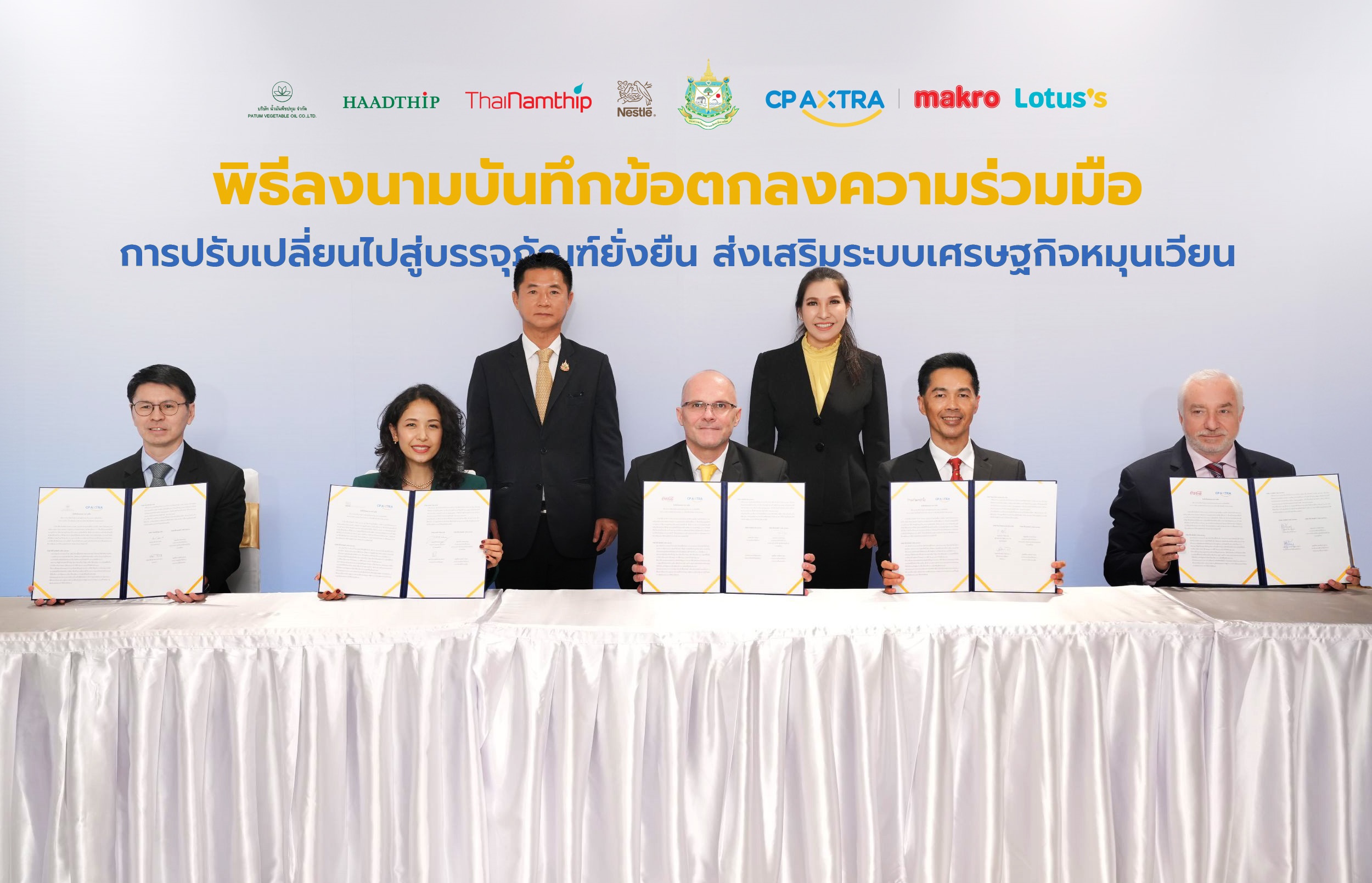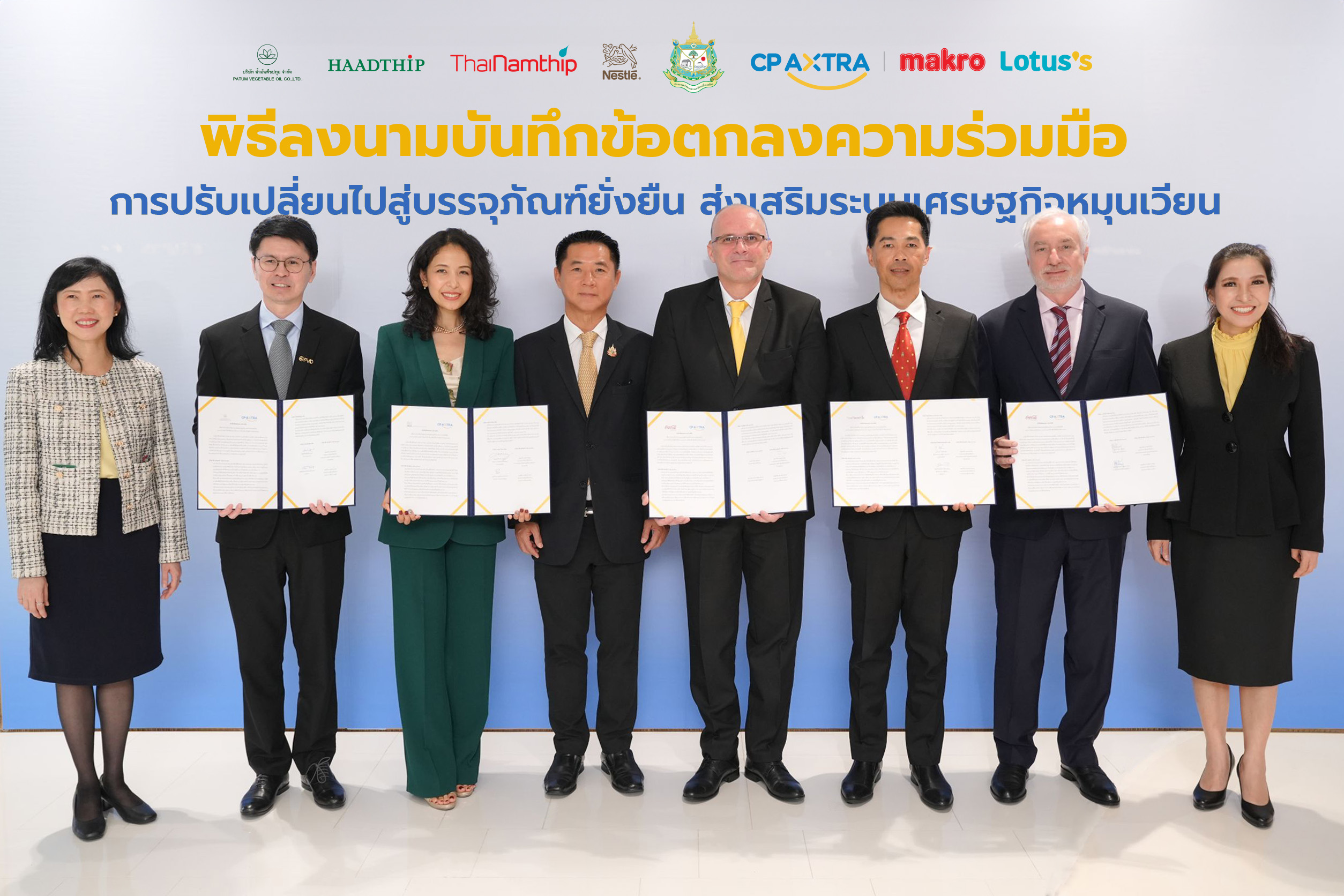 Bangkok – 19 August 2024 – CP Axtra Public Company Limited, a leading wholesaler and retailer under the ‘Makro-Lotus’s’ brand, has signed a Memorandum of Understanding (MoU) with four prominent partners: Nestlé (Thai) Limited, ThaiNamthip Company Limited, HaadThip Public Company Limited, and Pathum Vegetable Oil Company Limited. The partnership is poised to advance corporate sustainability, driven by a shared vision to minimize environmental impact. By promoting a circular economy through sustainable packaging, this partnership aims to drive positive change and strengthen sustainability within Thailand’s retail and wholesale industry.