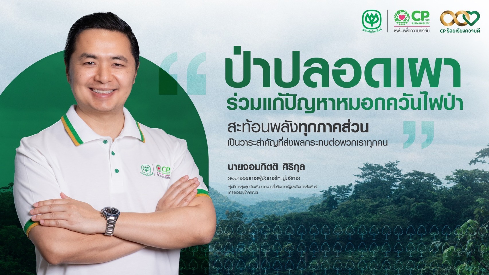 นายจอมกิตติ ศิริกุล รองกรรมการผู้จัดการใหญ่บริหาร ผู้บริหารสูงสุดด้านพัฒนาความยั่งยืนภาครัฐและกิจการสัมพันธ์ เครือเจริญโภคภัณฑ์ เปิดเผยว่า “โครงการป่าปลอดเผา เป็นกลไกสำคัญภายใต้วิสัยทัศน์ Net Zero 2030 จากนโยบายของคุณศุภชัย เจียรวนนท์ ประธานคณะผู้บริหาร เครือเจริญโภคภัณฑ์ โดยเชื่อว่าการขับเคลื่อนงานอนุรักษ์อย่างยั่งยืนต้องเริ่มจากฐานรากของชุมชน โดยเฉพาะการจัดการใบไม้แห้งอย่างเป็นระบบ ซึ่งเป็นจุดตั้งต้นของการลดเชื้อเพลิง ลดไฟป่า หมอกควัน และก๊าซเรือนกระจกได้อย่างยั่งยืน สอดคล้องกับเป้าหมายขององค์กรในการบรรลุความเป็นกลางทางคาร์บอนภายในปี 2030 และเดินหน้าสู่ Net Zero ในปี 2050 รวมถึงเป้าหมายการลดของเสียจากการฝังกลบให้เป็นศูนย์ (Zero Waste) ซึ่งเป็นหัวใจของการพัฒนาที่ยั่งยืนอย่างแท้จริง โครงการนี้พิสูจน์ให้เห็นว่า หากมีการบริหารจัดการอย่างมีแบบแผนและได้รับความร่วมมือจากทุกภาคส่วน ‘ป่าปลอดเผา’ จะสามารถต่อยอดเป็นโมเดลการจัดการหมอกควันไฟป่าที่ใช้ได้จริงในระดับประเทศ และเป็นแนวทางสำคัญในการพลิกฟื้นป่า สร้างอากาศดี และยกระดับคุณภาพชีวิตของประชาชนได้อย่างเป็นรูปธรรม”