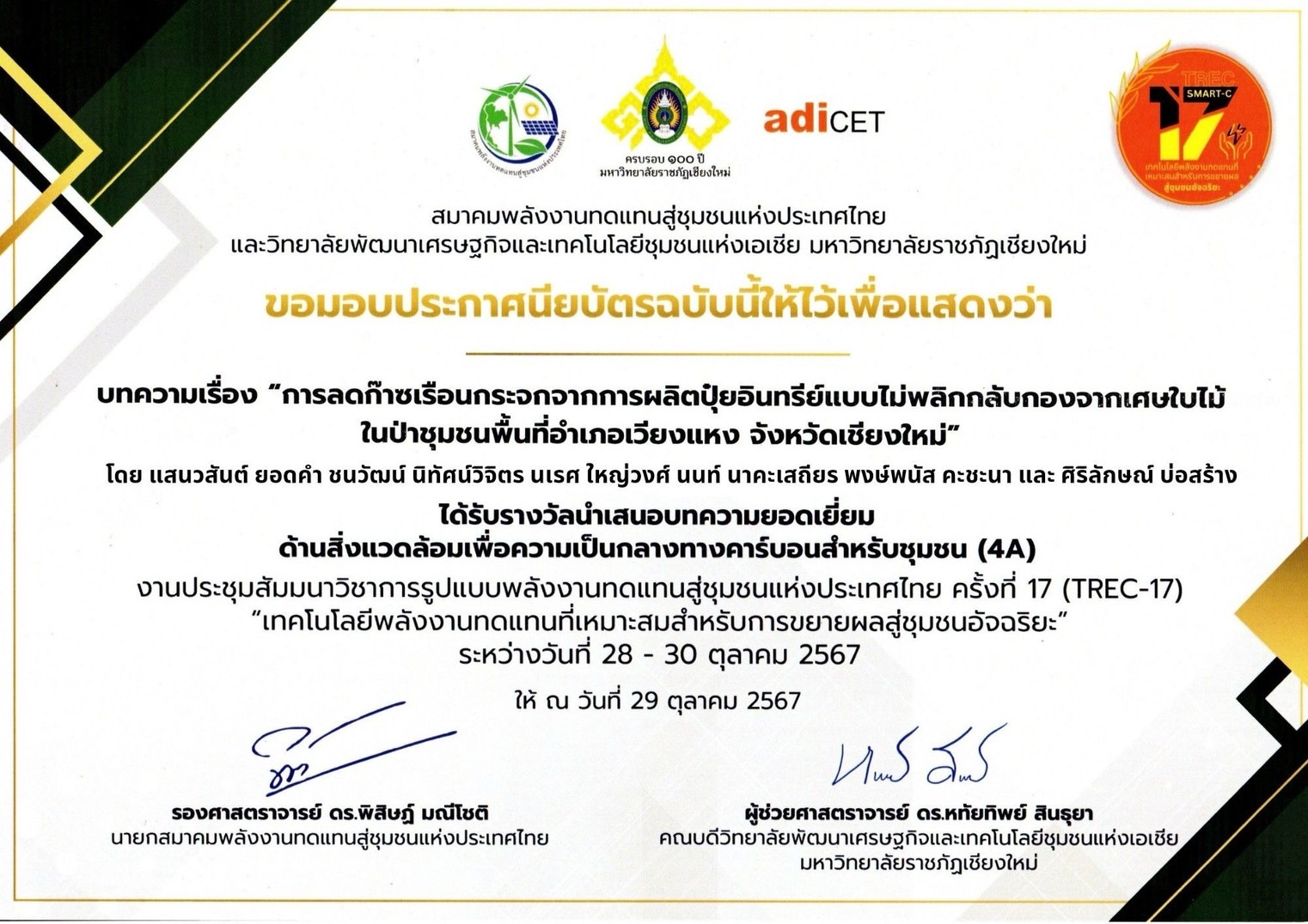 ทั้งนี้ “โครงการป่าปลอดเผา” ยังต่อยอดศึกษางานวิจัยร่วมกับมหาวิทยาลัยแม่โจ้ ในหัวข้อ “การลดก๊าซเรือนกระจกจากการผลิตปุ๋ยอินทรีย์แบบไม่พลิกกลับกองจากเศษใบไม้ในป่าชุมชนพื้นที่ อ.เวียงแหง จ.เชียงใหม่” เพื่อประเมินความสามารถในการลดก๊าซเรือนกระจกของโครงการ โดยใช้วิธีการคำนวณตามวิธีที่องค์การบริหารจัดการก๊าซเรือนกระจก (องค์การมหาชน) หรือ อบก. พบว่า สามารถลดการปล่อยก๊าซเรือนกระจกได้ ประมาณ 102.97 ตันคาร์บอนไดออกไซด์เทียบเท่า เมื่อเทียบกับการเผาเศษใบไม้ ซึ่งได้รับรางวัลบทความยอดเยี่ยมด้านสิ่งแวดล้อมเพื่อความเป็นเลิศสำหรับชุมชน ในงานประชุมสัมมนาวิชาการรูปแบบพลังงานทดแทนเพื่อชุมชนแห่งประเทศไทย ครั้งที่ 17 (TREC-17) ที่ผ่านมา