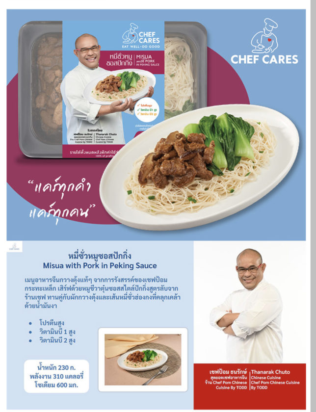 บริษัท เชฟแคร์ส โปรเจ็ค จำกัด ผู้ผลิตอาหารสำเร็จรูปพร้อมรับประทานเพื่อสุขภาพ ‘เชฟแคร์ส เรดดี้มีล’ ที่รังสรรค์โดยเชฟมืออาชีพระดับโลก เปิดตัวเมนูใหม่ ‘หมี่ซั่วหมู ซอสปักกิ่ง’ เมนูอาหารจีนกวางตุ้งแท้ ๆ จากสุดยอดเชฟอาหารจีน เชฟป้อม ธนรักษ์ ชูโต ที่ปรุงด้วยวัตถุดิบชั้นเลิศ หมูชีวา เนื้อหมูที่ได้จากการคัดเลี้ยงแบบพิเศษ ตุ๋นด้วยซอสสไตล์ปักกิ่ง ซอสสูตรลับของเชฟป้อม คู่กับ ผักกวางตุ้งและเส้นหมี่ซั่วฮ่องกง คลุกเคล้าด้วยน้ำมันงา ทำให้ได้เมนูสุดยอดแห่งความอร่อย อุดมด้วยโปรตีน และวิตามิน B1, B2 เพียบพร้อมด้วยคุณค่าทางโภชนาการอย่างครบถ้วน พร้อมเสิร์ฟให้ทุกคนได้ลิ้มลองแล้วที่ 7-Eleven และ Makro ในราคาเพียง 69.- บาท