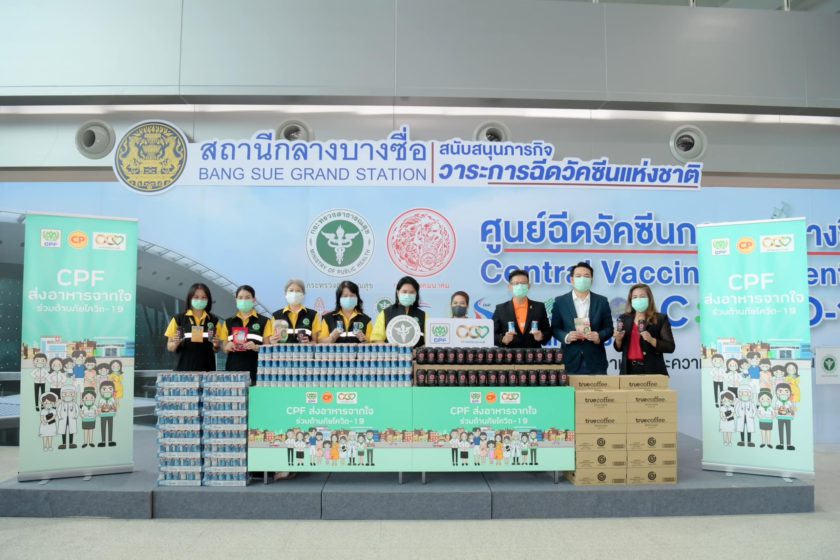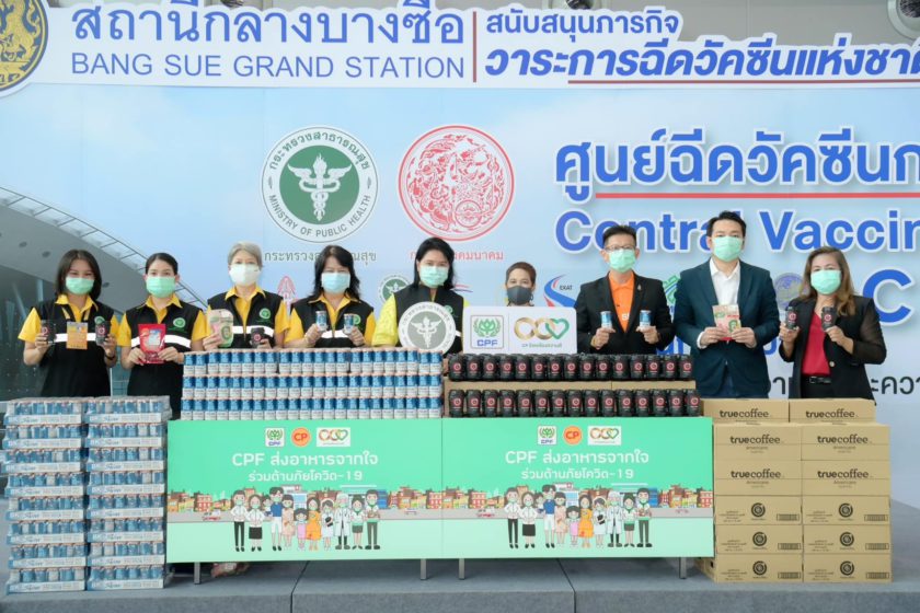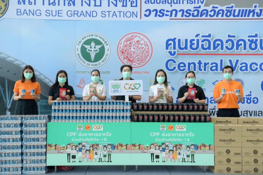 CPF ผนึกกำลัง ซีพี อินเตอร์เทรด เดินหน้าส่งมอบผลิตภัณฑ์อาหารพร้อมทานและเครื่องดื่ม ในโครงการ “CPF ส่งอาหารจากใจ ร่วมต้านภัยโควิด-19” แก่ พญ. มิ่งขวัญ วิชัยดิษฐ ผู้อำนวยการสถาบันโรคผิวหนัง กรมการแพทย์ ตามนโยบายเครือเจริญโภคภัณฑ์ เพื่อสนับสนุนการปฏิบัติงานของทีมแพทย์ พยาบาล เจ้าหน้าที่ และอาสาสมัคร ในการฉีดวัคซีนป้องกันโควิด-19 ให้แก่ประชาชน โดยมี คุณพรรณินี นันทพานิช รองกรรมการผู้จัดการอาวุโส และ คุณพิษณุ พันธ์เกตุ ผู้ช่วยกรรมการผู้จัดการ และจิตอาสา CPF ร่วมส่งมอบ เพื่อเป็นส่วนหนึ่งในการร่วมสร้างภูมิคุ้มกันหมู่ให้แก่ประเทศไทย ณ ศูนย์ฉีดวัคซีนกลางบางซื่อ สถานีกลางบางซื่อ