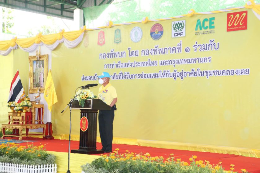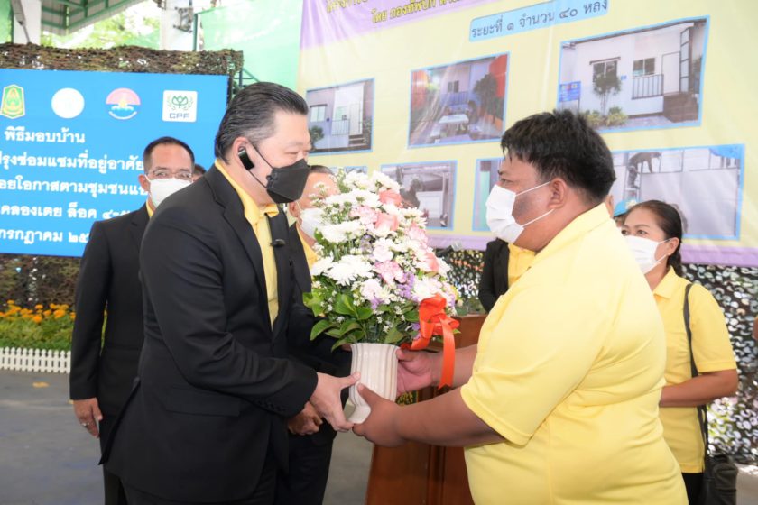 พลโท สุขสรรค์ หนองบัวล่าง แม่ทัพภาคที่ 1 พร้อมด้วย คุณสุภกิต เจียรวนนท์ ประธานกรรมการ เครือ CP-CPF, คุณพงษ์ วิเศษไพฑูรย์ ประธานกรรมการ กลุ่มธุรกิจเกษตรอุตสาหกรรมสัตว์น้ำ เขตประเทศอินเดีย CPF, ผู้แทนจากการท่าเรือแห่งประเทศไทย สำนักงานเขตคลองเตย และสวนนงนุช ร่วมส่งมอบบ้านพักที่สร้างแล้วเสร็จ จำนวน 7 หลังสุดท้าย รวมทั้งสิ้น 87 หลัง แก่ชาวชุมชนคลองเตย ถวายเป็นพระราชกุศล เนื่องในโอกาสวันเฉลิมพระชนมพรรษา พระบาทสมเด็จพระวชิรเกล้าเจ้าอยู่หัว วันที่ 28 กรกฎาคม 2565 เพื่อยกระดับคุณภาพชีวิตและสร้างสุขอนามัยที่ดีแก่กลุ่มเปราะบาง ภายใต้ “โครงการสร้างและซ่อมแซมบ้านพักให้กับผู้ยากไร้และด้อยโอกาส” พร้อมถุงยังชีพ เครื่องอุปโภคบริโภค รวมถึงชุดปลูกผักสวนครัวและยาสมุนไพรฟ้าทะลายโจรจากเครือซีพี ตามโครงการ “ซีพี ปันปลูก ฟ้าทะลายโจร” เพื่อให้คนไทยเข้าถึงยาสมุนไพรไทย ณ ลานกีฬา ล็อค 4-5-6 ชุมชนคลองเตย
