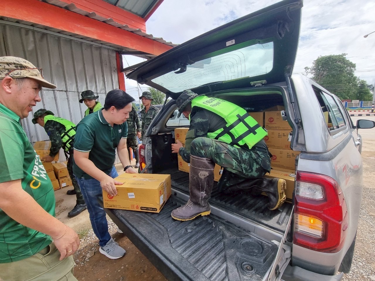 โดยมี ร้อยเอกธวัช ขันคำ ผู้แทนจากมณฑลทหารบกที่ 37 และนายฐิติพันธ์ เข็มขาว นายกองค์การบริหารส่วนส่วนตำบลแม่เปา ได้ร่วมรับมอบวัตถุดิบซีพี อาทิ ไข่ไก่สด เนื้อไก่ และน้ำดื่ม จากนางศิริลักษณ์ บ่อสร้าง ผู้จัดการฝ่าย ด้านพัฒนาความยั่งยืนภาครัฐและกิจการสัมพันธ์ เครือเจริญโภคภัณฑ์ และนายวรพล ด้วงชมภู เจ้าหน้าที่ขายอาวุโส บริษัท ชี พี เอฟ โกลบอลฟู้ดโซลูชั่นจำกัด มหาชน ผู้แทนจากกลุ่มบริษัทในเครือซีพีเอฟ โดยวัตถุดิบเหล่านี้จะถูกนำไปแจกจ่ายให้กับพี่น้องประชาชนในพื้นที่อำเภอพญาเม็งราย จังหวัดเชียงราย ซึ่งมีครัวเรือนผู้ประสบภัยกว่า 3,000 ครัวเรือน โดยมีศูนย์บรรเทาสาธารณภัยมณฑลทหารบกที่ 37 กองทัพบก ได้จัดกำลังพลทหารเป็นกำลังสำคัญในการกระจายอาหารและสิ่งของจำเป็นไปยังผู้ประสบภัยในพื้นที่ต่าง ๆ ของจังหวัดเชียงราย