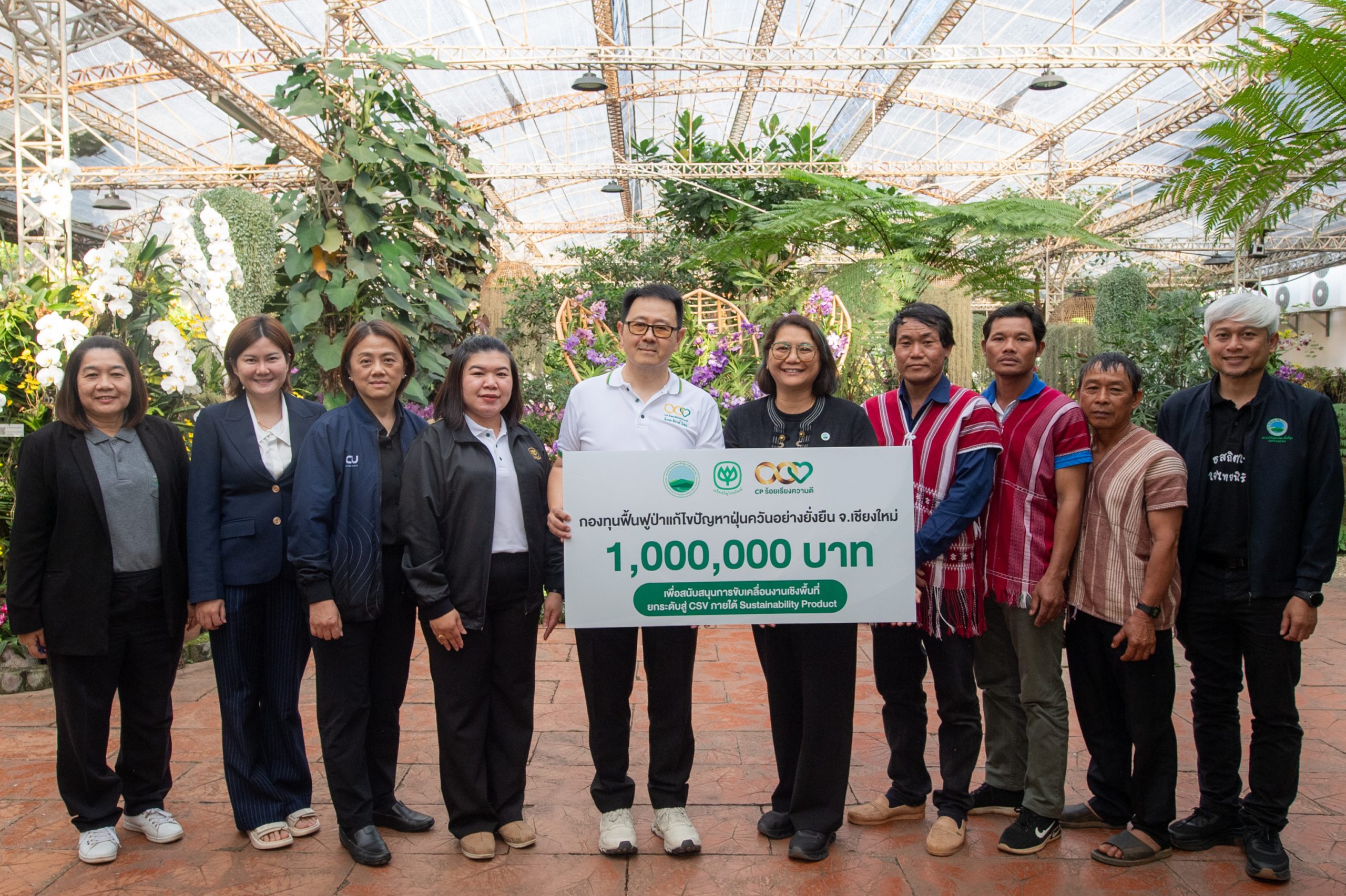 นายณรงค์ เจียรวนนท์ รองประธานอาวุโส เครือเจริญโภคภัณฑ์ พร้อมด้วย นางสาวพิไลลักษณ์ พิชัยวัตต์ ผู้ช่วยกรรมการผู้จัดการด้านความยั่งยืนภาครัฐและกิจการสัมพันธ์ เครือเจริญโภคภัณฑ์ และคณะผู้บริหาร มอบกองทุน “ฟื้นฟูป่าแก้ไขปัญหาฝุ่นควันอย่างยั่งยืน” จำนวน 1,000,000 บาท ผ่านผู้แทน นางอาณดา นิรันตรายกุล รองผู้อำนวยการด้านการพัฒนา สถาบันวิจัยและพัฒนาพื้นที่สูง (องค์การมหาชน) พร้อมด้วย นางสาวทินรัตน์ พิทักษ์พงศ์เจริญ ผู้อำนวยการอุทยานหลวงราชพฤกษ์ ผู้ช่วยศาสตราจารย์ ดร.จิรวรรณ กิจชัยเจริญ รองคณบดีฝ่ายยุทธศาสตร์และแผน คณะเกษตรศาสตร์ มหาวิทยาลัยเชียงใหม่ เป็นองค์กรกลาง บริหารจัดการส่งต่อให้เกษตรกรจาก 3 หมู่บ้าน บ้านแม่แฮใต้ บ้านแม่ตูม ต.ปางหินฝน อ.แม่แจ่ม จ.เชียงใหม่ เพื่อเสริมศักยภาพการฟื้นฟูป่า ลดปัญหาหมอกควันและฝุ่น PM2.5 ควบคู่การสร้างอาชีพและรายได้ที่มั่นคงให้แก่ชุมชนบนพื้นที่สูง พร้อมยกระดับการดำเนินงานเชิงพื้นที่สู่การสร้างคุณค่าร่วม CSV (Creating Shared Value) ซึ่งสอดคล้องกับนโยบายการพัฒนาอย่างยั่งยืนของเครือเจริญโภคภัณฑ์ ที่มุ่งขับเคลื่อน “3 Big Goals สู่ความยั่งยืน” ได้แก่ การมุ่งสู่ Carbon Neutrality ภายในปี พ.ศ. 2573 และ Net Zero ภายในปี พ.ศ. 2593 การลดขยะและของเสียเป็นศูนย์ตามหลักเศรษฐกิจหมุนเวียน (Zero Waste to Landfill) รวมถึง การส่งเสริมการเข้าถึงการศึกษาที่มีคุณภาพให้แก่เยาวชนและผู้ด้อยโอกาสทั่วประเทศ ผ่านการทำงานร่วมกับภาคีเครือข่ายในพื้นที่อย่างบูรณาการ เพื่อสนับสนุนการพัฒนาเศรษฐกิจ สังคม และสิ่งแวดล้อมให้เติบโตอย่างสมดุลและยั่งยืนในระยะยาว