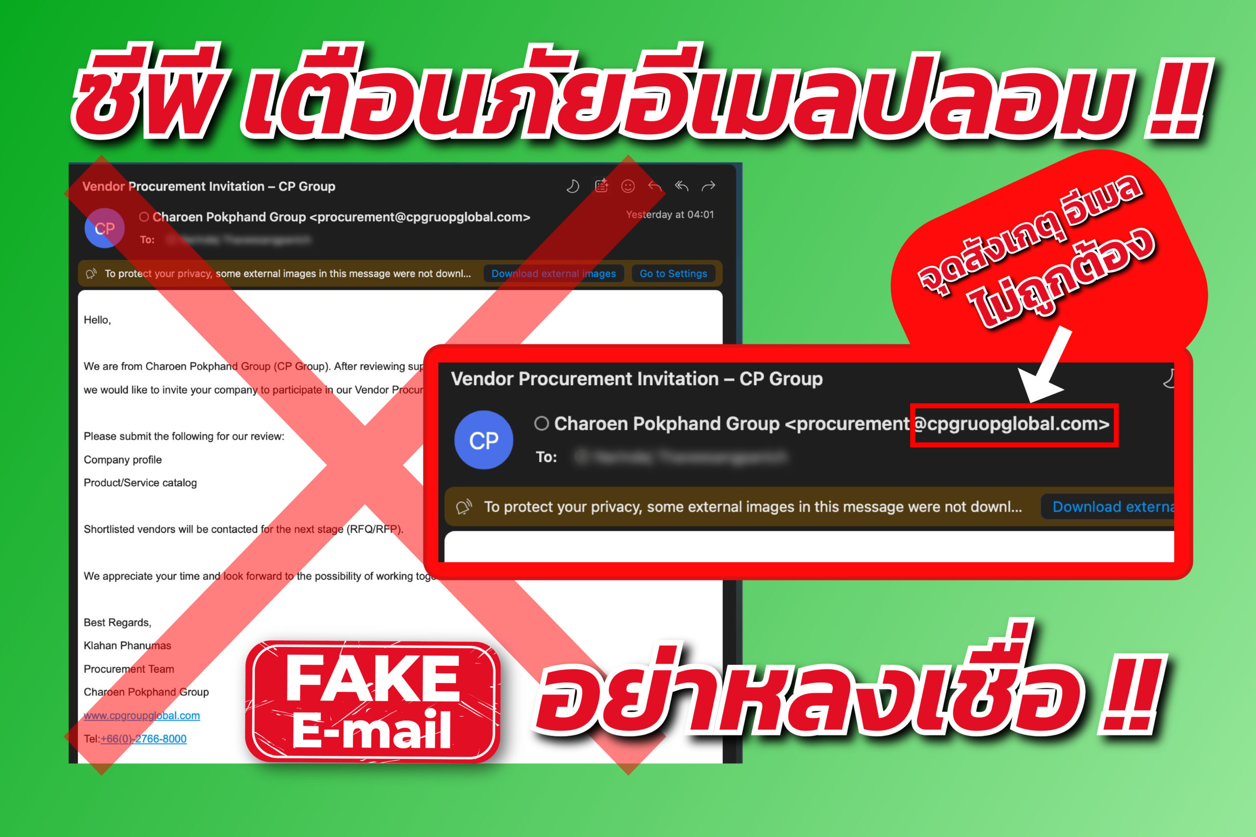 คุณวรวิทย์ วรุตบางกูร หัวหน้าคณะผู้บริหารด้านกำกับการปฏิบัติตามกฎเกณฑ์ เครือเจริญโภคภัณฑ์ เปิดเผยว่า “อีเมลดังกล่าวเป็นอีเมลปลอม ไม่มีความเกี่ยวข้องใด ๆ กับเครือเจริญโภคภัณฑ์ ผู้รับสามารถสังเกตได้เบื้องต้นจากชื่อโดเมน cpgruopglobal ซึ่งสะกดคำว่า group ผิดเป็น gruop การกระทำในลักษณะนี้ถือเป็นการหลอกลวงที่อาจนำไปสู่การขโมยข้อมูลส่วนบุคคล หรือสร้างความเสียหายทางการเงินได้”