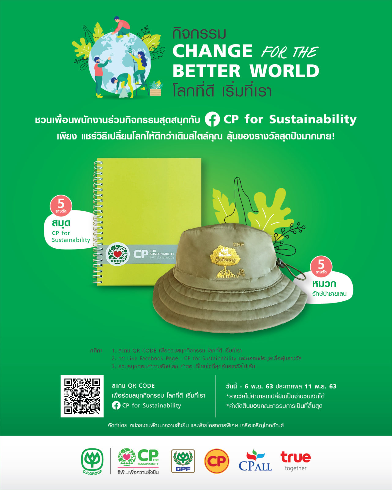 CP for Sustainability ชวนเพื่อนพนักงานร่วมสนุกกับกิจกรรม CHANGE FOR THE BETTER WORLD โลกที่ดี เริ่มที่เรา เพียงแชร์วิธีเปลี่ยนโลกให้ดีกว่าเดิมสไตล์คุณ ลุ้นของรางวัลสุดน่ารักมากมาย!