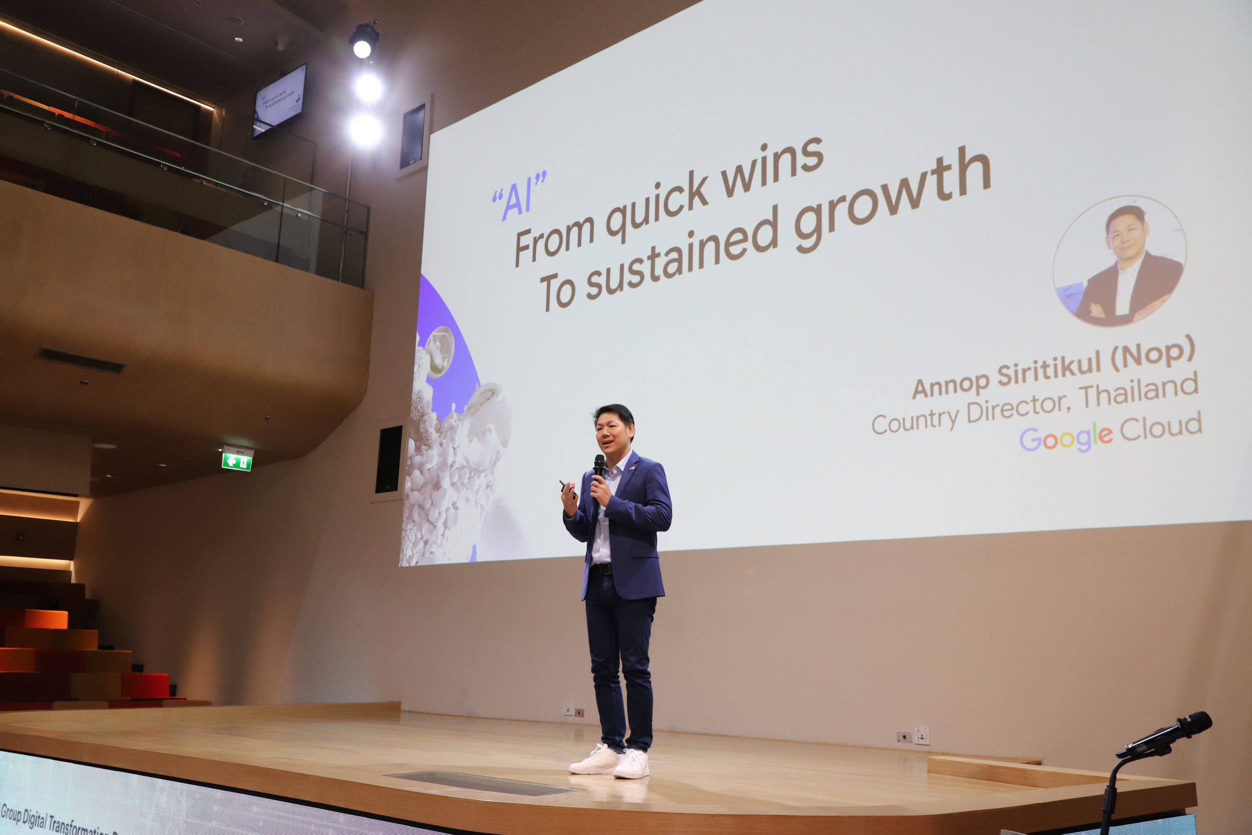 นอกจากนี้ภายในงานยังได้รับเกียรติจากวิทยากรผู้ทรงคุณวุฒิ 3 ท่านให้การบรรยาย ดร.อธิป อัศวานันท์ ผู้อำนวยการสภาดิจิทัลเพื่อเศรษฐกิจและสังคมแห่งประเทศไทย ได้บรรยายและให้ข้อมูลเกี่ยวกับ AI ในระดับประเทศ โดยได้กล่าวถึงนโยบายของภาครัฐที่ผ่านมา รวมถึงปัจจัยพื้นฐานสำคัญต่าง ๆ ที่ประเทศไทยยังขาดเมื่อเทียบกับต่างประเทศ และได้ฝากฝังให้ภาคเอกชนทุกธุรกิจสามารถเสนอแนวทางที่เป็นประโยชน์ต่อประเทศเพื่อผลักดันกับรัฐบาลให้เกิดเป็นนโยบาย คุณอรรณพ ศิริติกุล Country Director, Google Cloud ประเทศไทย ได้แชร์แนวคิด AI ของ Google และกรณีการใช้งานที่มีศักยภาพในอุตสาหกรรมต่าง ๆ รวมถึงได้กล่าวถึงการร่วมมือระหว่างเครือฯ และ Google ในการพัฒนากรณีศึกษาด้าน AI ซึ่งคาดหวังว่าการร่วมมือนี้จะดำเนินงานต่อไป และคุณณัฐพัชญ์ นราพิมพ์สกุล Head of Consulting & Professional Service จาก True IDC ได้ฉายภาพเกี่ยวกับการทำงานเบื้องหลังโครงสร้างพื้นฐานคลาวด์ โดยแต่ละท่านได้ให้ความรู้และฉายภาพเทคโนโลยีให้กับผู้เข้าร่วมงานได้เป็นอย่างดี