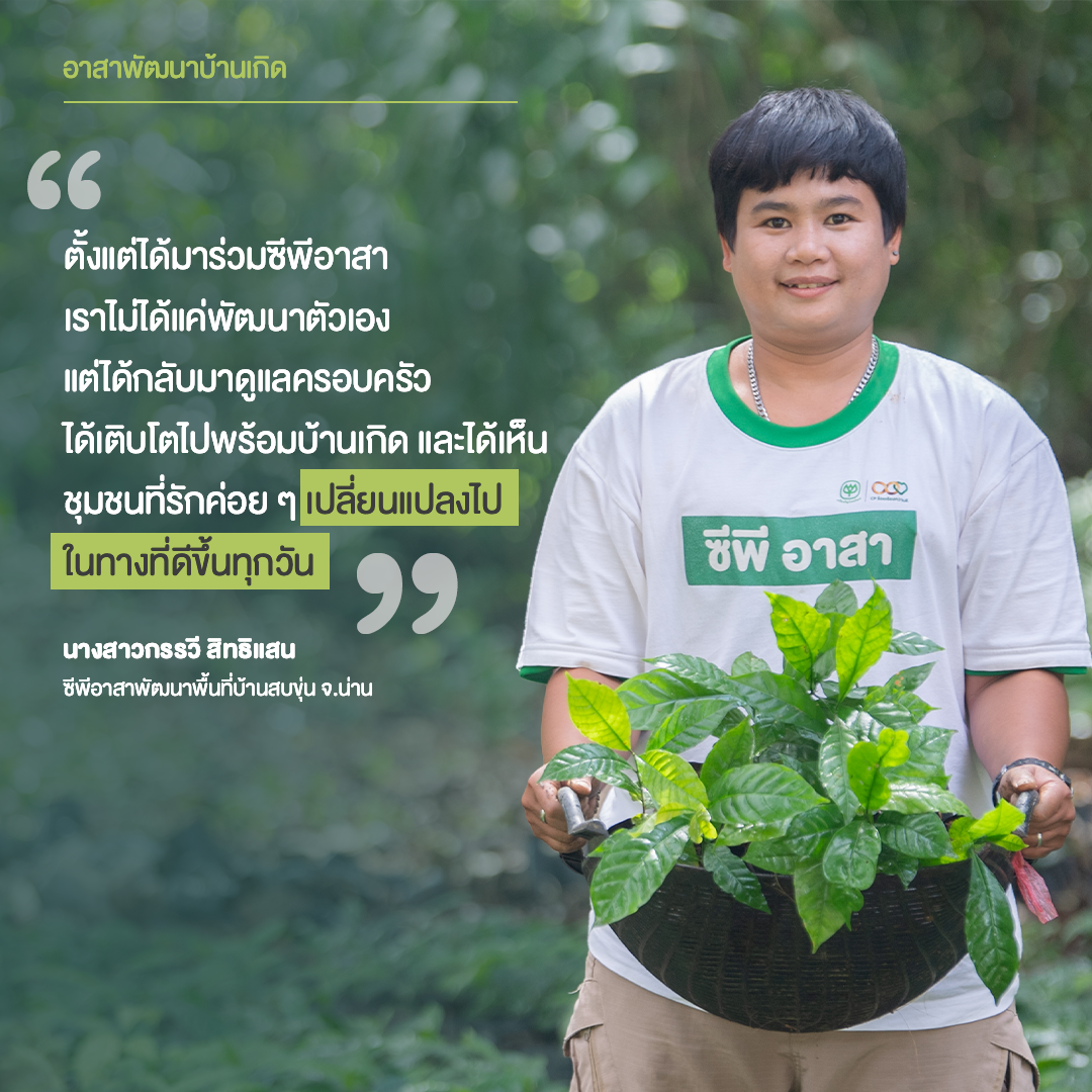 นอกจากบทบาทซีพีอาสาแล้ว เธอยังได้เห็นภาพรวมของการพัฒนาชุมชนในฐานะคนในพื้นที่ ไม่ว่าจะเป็นการพัฒนาองค์ความรู้กาแฟตั้งแต่ต้นน้ำถึงปลายน้ำ การยกระดับเศรษฐกิจชุมชน การสร้างแหล่งเรียนรู้ให้เยาวชน การส่งเสริมอาชีพใหม่ และการฟื้นฟูพื้นที่สีเขียวควบคู่กับการพัฒนาเศรษฐกิจท้องถิ่น