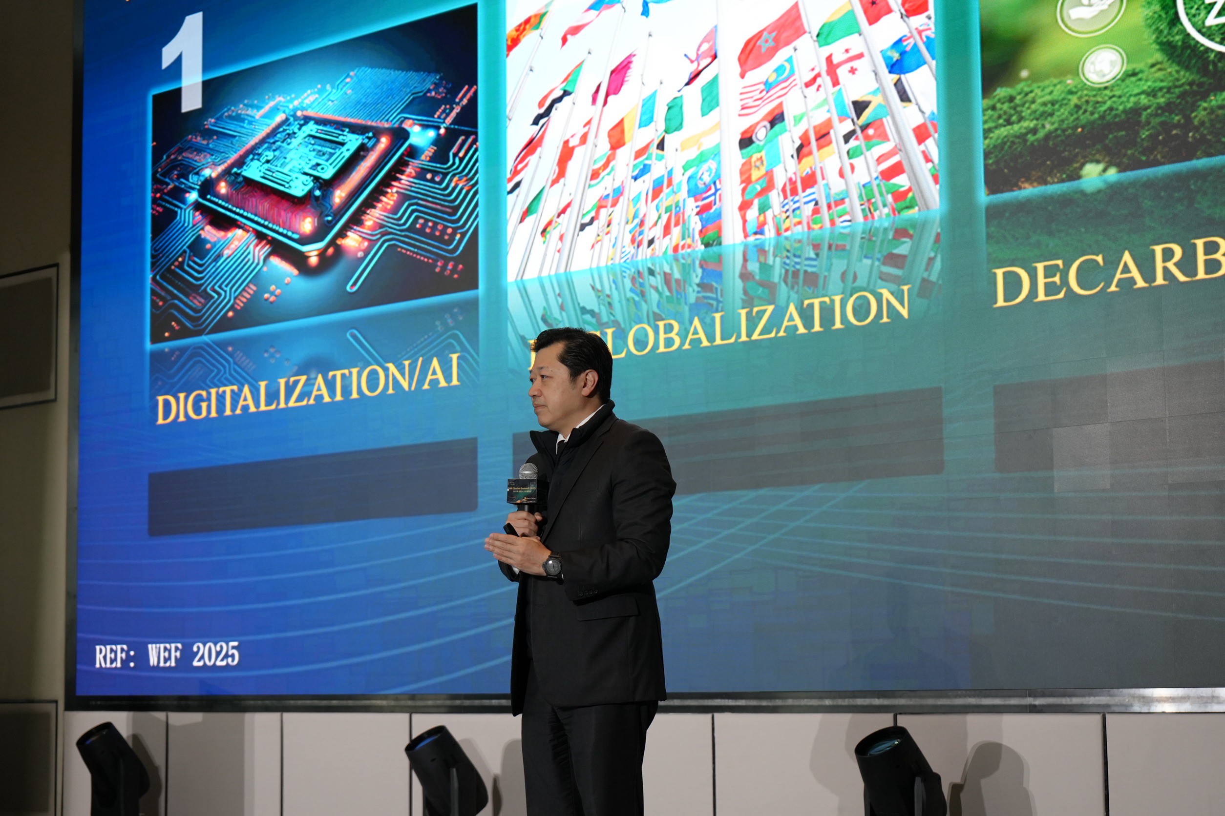 ขณะที่ คุณศุภชัย เจียรวนนท์ ประธานคณะผู้บริหาร เครือเจริญโภคภัณฑ์ กล่าวถึงการเปลี่ยนผ่านองค์กรสู่ยุคดิจิทัลและความท้าทายระดับโลก อาทิ การปฏิวัติด้าน AI การเปลี่ยนแปลงสภาพภูมิอากาศ และการแข่งขันด้านบุคลากร ซึ่งล้วนเป็นโอกาสสำคัญที่เครือซีพีจะสามารถยกระดับสู่การเป็นองค์กรผู้นำระดับโลกอย่างแท้จริง คุณศุภชัยยังได้กล่าวถึงความท้าทาย 3 ด้าน หรือ “3D Challenges” ได้แก่ Digitalization, Deglobalization และ Decarbonization พร้อมเน้นว่า “AI คือแรงขับเคลื่อนของทุกการเปลี่ยนแปลง” ทั้งนี้ได้ตั้งเป้าหมายการพัฒนาองค์กรให้เติบโตอย่างยั่งยืน ภายใต้ค่านิยมหลัก 6 ประการของเครือซีพี ได้แก่ สามประโยชน์ ทำเร็วและมีคุณภาพ ทำเรื่องยากให้เป็นเรื่องง่าย ยอมรับการเปลี่ยนแปลง สร้างสรรค์สิ่งใหม่ และมีคุณธรรมและความซื่อสัตย์