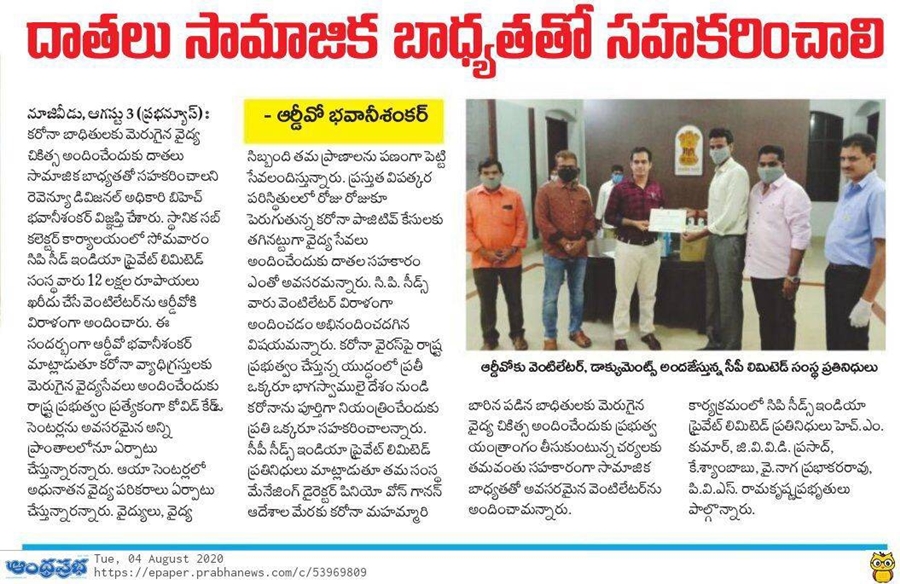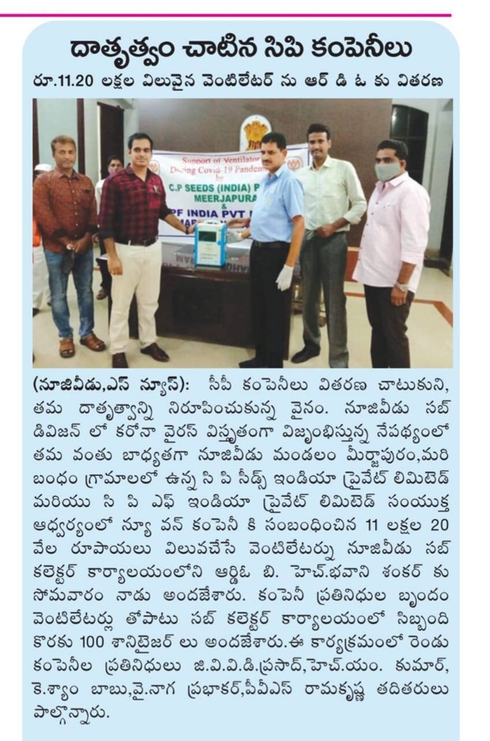 เมื่อวันที่ 3 สิงหาคม 2563 ที่ผ่านมา Mr.H N Kumar HR Manager CP Seeds (India) Pvt.,Ltd และ Mr.PVS Ramakrishna HR Manager CPF India Pvt.,Ltd ได้ทำการส่งมอบเครื่องช่วยหายใจกับ รองนายก องค์การบริหารส่วนจังหวัด Mr.B.H.Bhavani Sankar RDO (Revenue Divisional Officer) AP state Revenue Department ผู้ที่ได้รับมอบหมายเข้ามาดูแลในพื้นที่ Nuzvid Division ซึ่งทางองค์การบริหารส่วนจังหวัดประทับใจในความช่วยเหลือที่ทางบริษัทมอบเครื่องช่วยหายใจให้ เนื่องจากทางเขต Nuzvid ได้มีการเปิดศูนย์ Covid 19 Center ขึ้น เพราะในพื้นที่มีการแพร่ระบาด C0vid 19 อย่างรวดเร็ว ซึ่งเครื่องช่วยหายใจนี้จะสามารถช่วยคนได้อีกหลายชีวิต