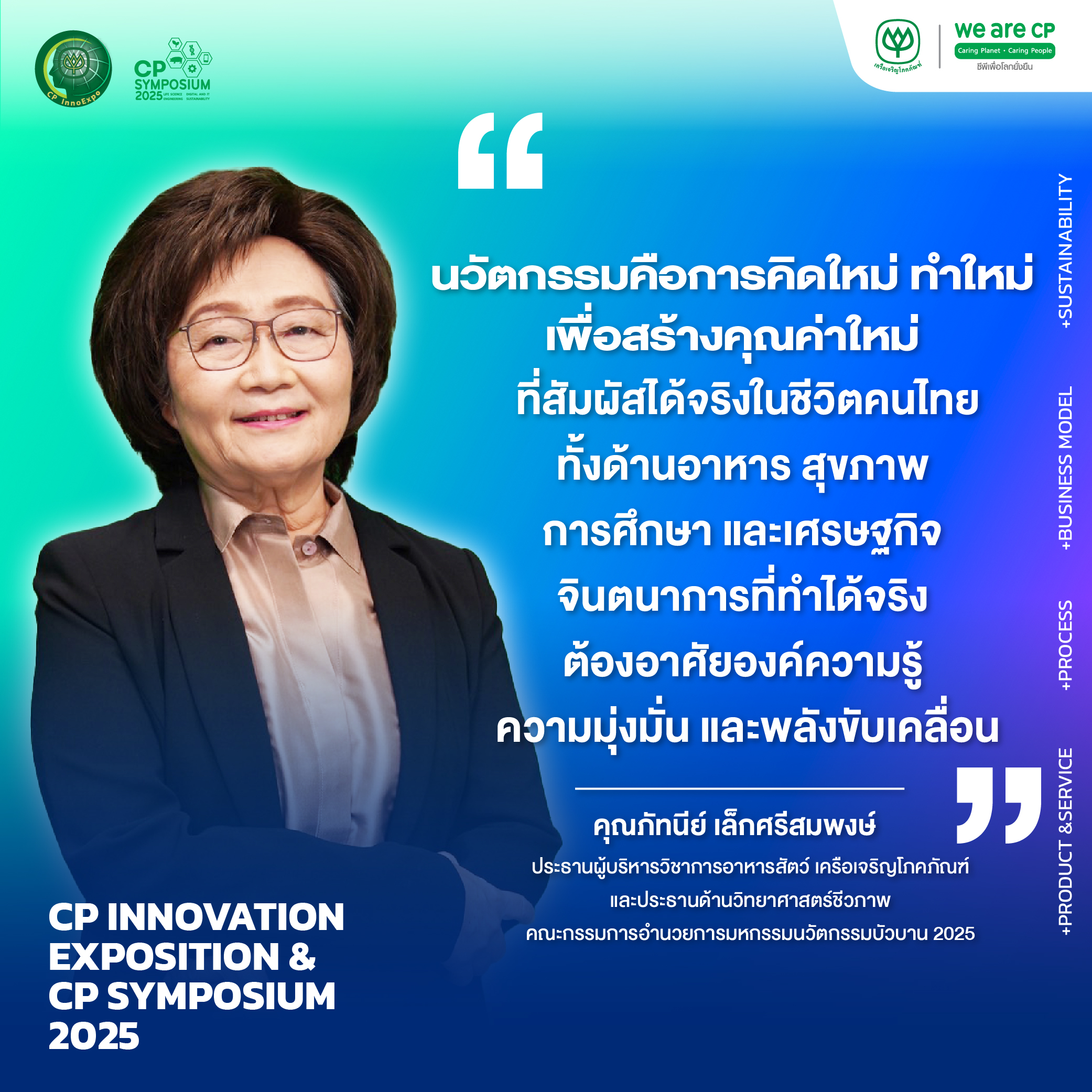 นอกจากนวัตกรรมที่นำมาจัดแสดงแล้ว ยังมีการประชุมวิชาการ “CP Symposium 2025” โดยในปีนี้ มีผลงานด้านวิชาการถึง 117 ผลงาน ซึ่งครอบคลุม 4 สาขาหลัก คือ วิทยาศาสตร์ชีวภาพ, วิศวกรรม, ดิจิทัล-ไอที และความยั่งยืน ซึ่งเน้นการต่อยอดสู่การใช้งานจริงในธุรกิจและชุมชน