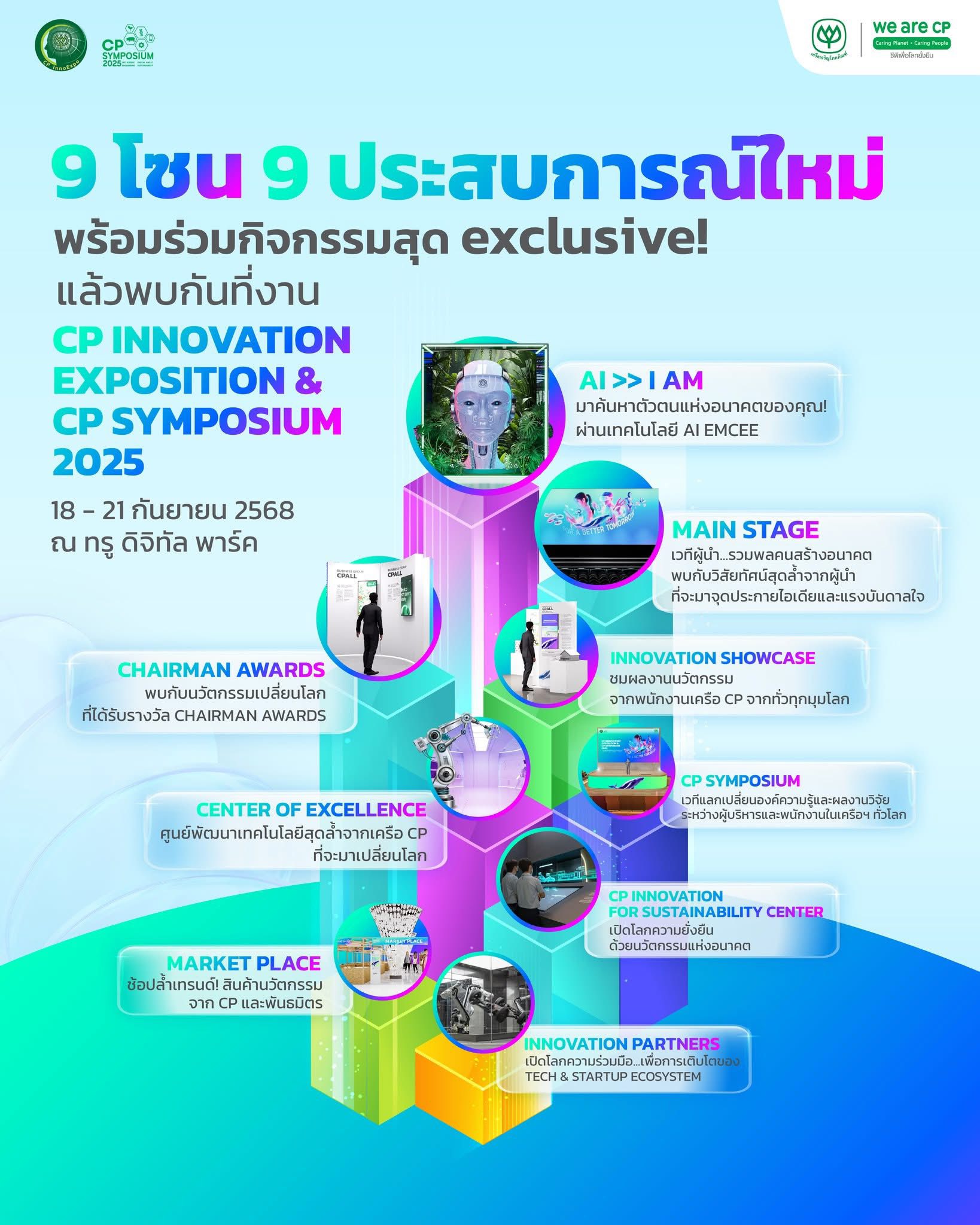 ท้ายสุด ดร.อาชว์ ยังเชิญชวน ผู้บริหารและพนักงานทุกระดับ ร่วมเป็นส่วนหนึ่งของงาน เพื่อแลกเปลี่ยนแรงบันดาลใจและต่อยอดนวัตกรรมใหม่ ๆ งาน CP Innovation Exposition & Symposium 2025 จะจัดขึ้นระหว่างวันที่ 18 – 21 กันยายน 2568 นอกจากการนำเสนอผลงานนวัตกรรมกว่า 216 ชิ้นงาน แล้ว ภายในงานยังมีการประชุมวิชาการ และพิธีมอบรางวัลนวัตกรรมยอดเยี่ยม (Chairman Award) โดยมีผู้บริหารระดับสูงและบุคลากรจากทุกธุรกิจในเครือเข้าร่วมอย่างพร้อมเพรียง งานนี้ตอกย้ำพันธกิจของซีพีในการ “สร้างนวัตกรรมเพื่ออนาคตที่ยั่งยืน” และก้าวสู่การเป็น Tech Driven Company อย่างเต็มตัว