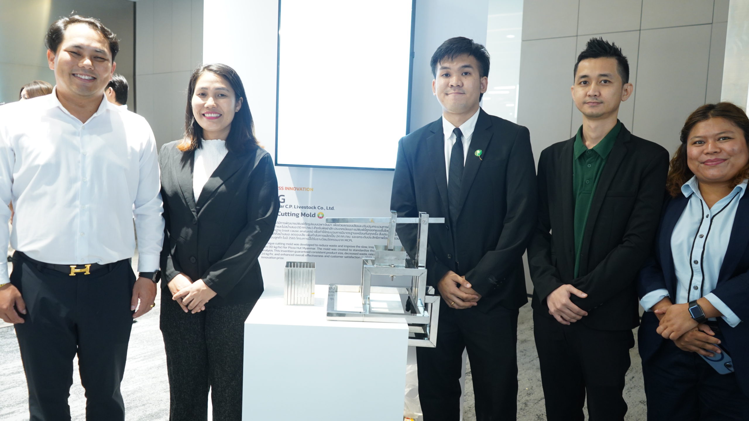 หนึ่งในไฮไลท์จาก Myanmar C.P. Livestock Co., Ltd. คือผลงาน “นวัตกรรมแม่พิมพ์หั่นแฮม (Ham Cutting Mold)” โดย คุณ Ye Min Htet – Project Manager (PLP), President Office ซึ่งพัฒนาขึ้นเพื่อแก้ปัญหาการหั่นแฮมแบบดั้งเดิมที่ต้องใช้แรงงานคน ทำได้ช้า ไม่สม่ำเสมอ และเกิดของเสียสูง