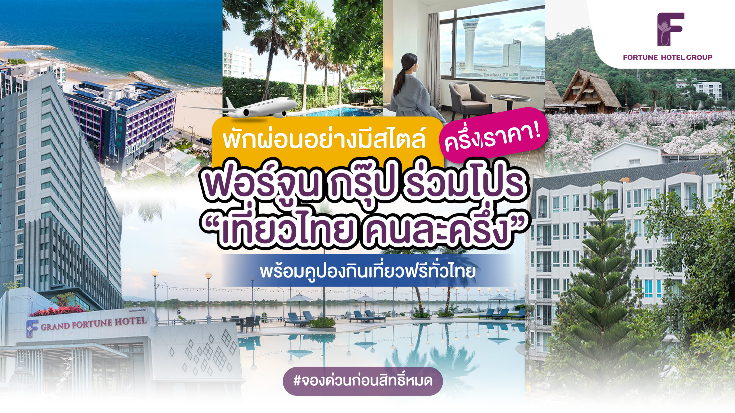 โรงแรมในเครือฟอร์จูน กรุ๊ป 8 แห่งทั่วประเทศไทย หนึ่งในกลุ่มธุรกิจของ บริษัท ซี.พี.แลนด์ จำกัด (มหาชน) หรือ CP LAND ขอเชิญชวนทุกท่านใช้สิทธิ์ในโครงการ เที่ยวไทยคนละครึ่ง เพื่อสนับสนุนการท่องเที่ยวไทย พร้อมรับส่วนลดค่าห้องพักสูงสุดถึง 50% และสิทธิพิเศษเพิ่มเติมเมื่อจองเข้าพักกับโรงแรมในเครือทั้ง 8 แห่งทั่วประเทศ