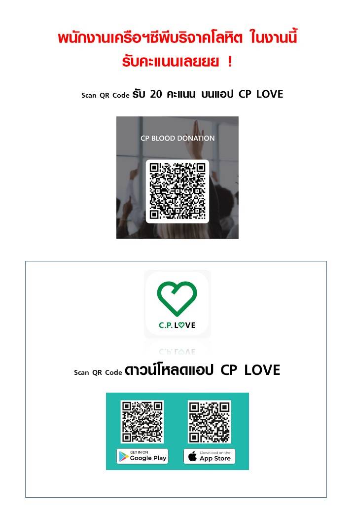 – ดาวน์โหลดและลงทะเบียนแอปพลิเคชั่น CP LOVE รับคะแนนจิตอาสา 20 คะแนน (V=Volunteer)