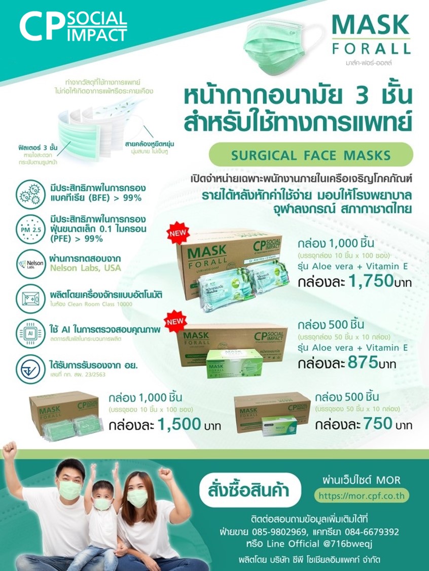 CP Mask for All หน้ากากอนามัยซีพี เปิดจำหน่ายแก่พนักงานเครือซีพี 2 รุ่นแบบมีอะโลเวลา+วิตามินอี และรุ่นปกติ