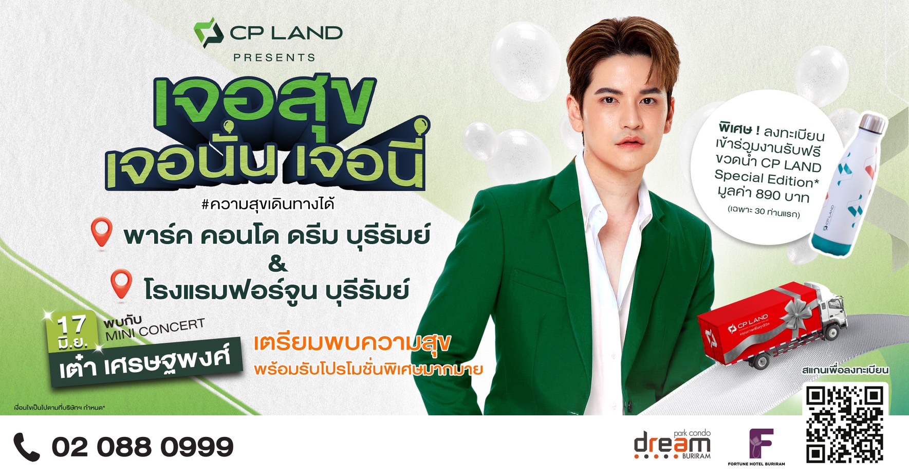 CP LAND เตรียมบุกบุรีรัมย์ นำทีมโดยนักร้อง เต๋า เศรษฐพงศ์ กับแคมเปญ CP LAND Presents เจอสุข เจอนั่น เจอนี่ ที่พาร์ค คอนโด ดรีม บุรีรัมย์ และโรงแรม ฟอร์จูน บุรีรัมย์ เปิดบ้านต้อนรับ จัดฟรีมินิคอนเสิร์ตเพื่อเสิร์ฟความบันเทิง พร้อมกิจกรรมให้ร่วมสนุกลุ้นรับของรางวัลมากมาย DIY Workshop และ Photo Booth นอกจากนี้ภายในงานยังเปิดให้ชมห้องคอนโดตัวอย่างใหม่สไตล์โมเดิร์นใจกลางเมืองบุรีรัมย์ พร้อมข้อเสนอสุดพิเศษ ราคาเริ่มต้น 1.19 ล้านบาท ส่วนลดสูงสุด 300,000 บาท และรับรถจักรยานยนต์ Scoopy I มูลค่า 50,000 บาท ทันทีไม่ต้องลุ้น นอกจากนี้ยังมีสิทธิพิเศษส่วนลด 30% มอบให้จากโรงแรมภายในเครือฟอร์จูนกรุ๊ปอีกด้วย