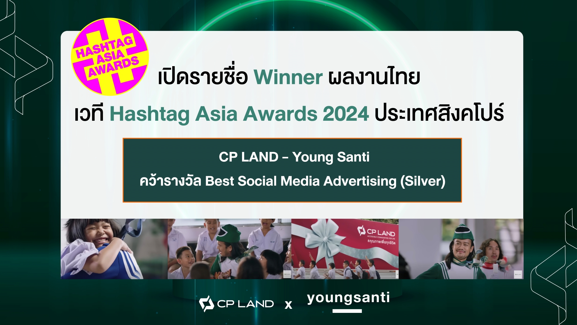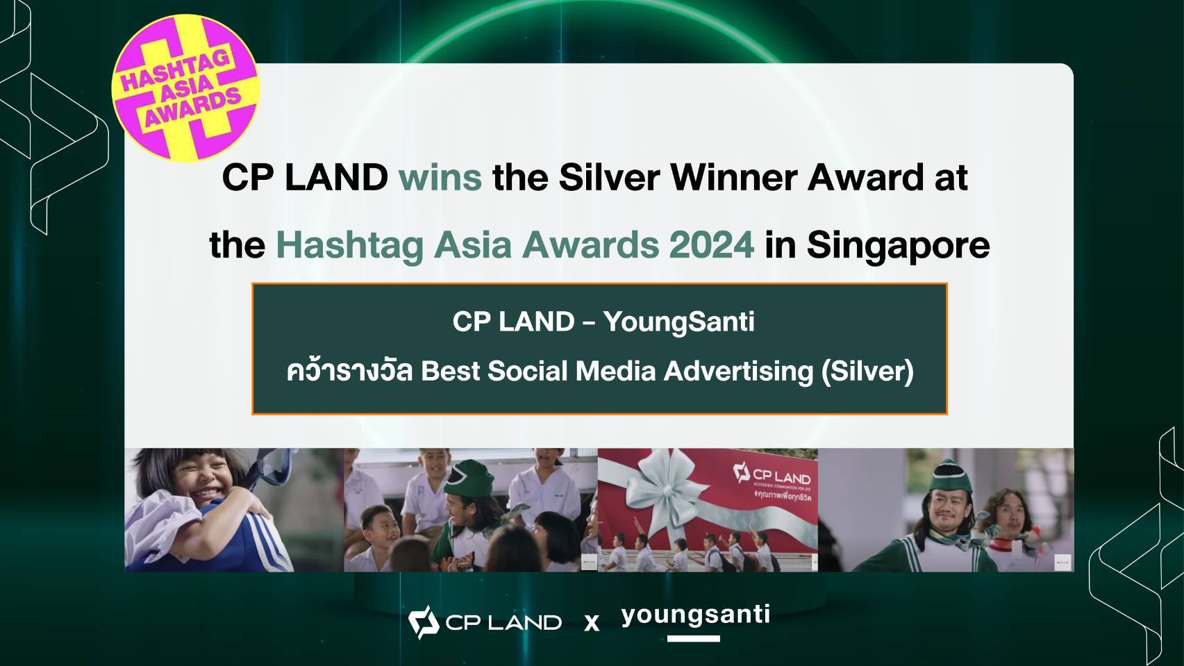 10 พฤษภาคม 2567 – บริษัท ซี.พี. แลนด์ จำกัด (มหาชน) หรือ CP LAND บริษัทผู้พัฒนาอสังหาริมทรัพย์ชั้นนำของประเทศไทยรายแรก การันตีความสำเร็จระดับเอเชีย คว้ารางวัล Silver Winner ในสาขา Best Social Media Advertising Campaign ในแคมเปญ “เจอสุข เจอนั่น เจอนี่ (Happiness is all Around)” จากเวที HASHTAG ASIA AWARDS 2024 ประเทศสิงคโปร์ ซึ่งเป็นหนึ่งในเวทีชั้นนำระดับเอเชียของเหล่านักการตลาด ที่ตัดสินผลงานโดยผู้เชี่ยวชาญด้านโซเชียลมีเดียที่เคยอาศัยหรือทำงานในเอเชียที่สามารถสร้างแรงกระเพื่อมและปรากฏการณ์สำคัญในโลกออนไลน์ได้อย่างเด่นชัด โดยเป็นความร่วมมือกับ เอเจนซี อย่างสันติ (Youngsanti) ในฐานะเอเจนซีผู้สนับสนุน ร่วมผลักดันแคมเปญนี้ขึ้นจนประสบความสำเร็จ