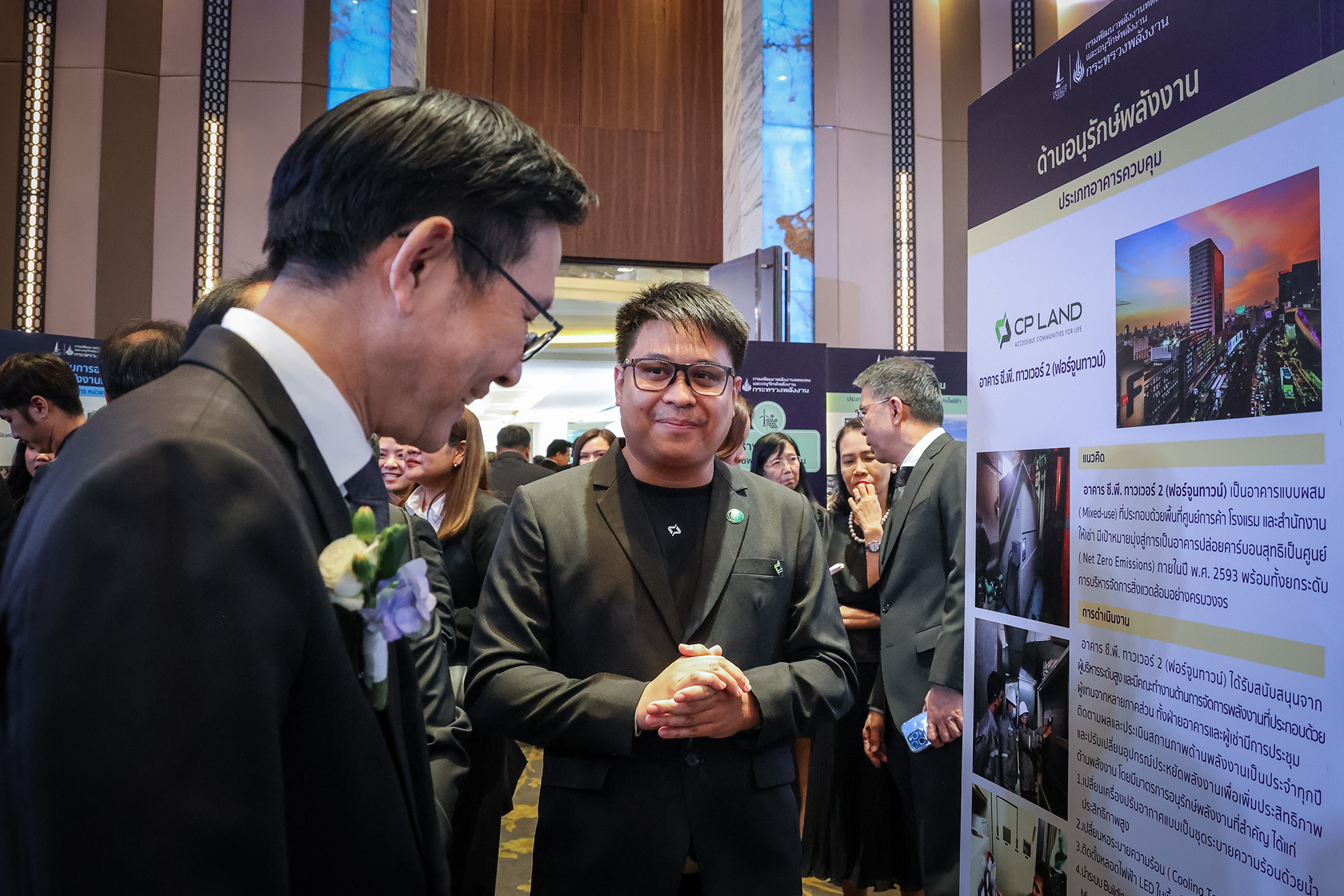 นอกจากนี้ ภายในงาน คุณจักรพันธ์ ปิยะพฤกษพรรณ ผู้อำนวยการบริหาร กลุ่มงานบริการองค์กร พร้อมด้วยทีมวิศวกรรมพลังงานของ CP LAND ได้ให้การต้อนรับรัฐมนตรีว่าการกระทรวงพลังงาน ในโอกาสเข้าเยี่ยมชมบูธแสดงผลงานด้านการบริหารจัดการพลังงานของบริษัทซึ่งนำเสนอแนวทางการดำเนินงานที่สามารถนำไปปรับใช้กับอาคารในพอร์ตโฟลิโอขององค์กรอย่างเป็นระบบ