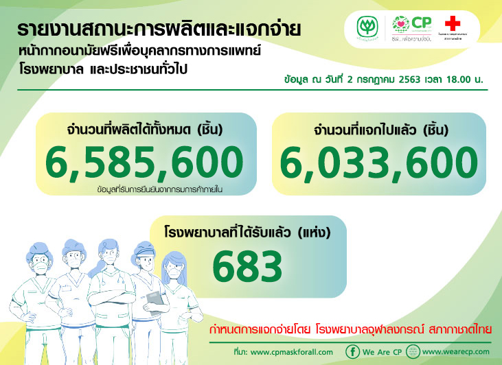 รายงานสถานะการผลิตและแจกจ่ายหน้ากากอนามัยฟรีเพื่อบุคลากรทางการแพทย์ รพ.และประชาชนทั่วไป / 2 ก.ค. 63 : 18.00 น. 3 กรกฎาคม 2563SystemCP Mask ภารกิจนี้เพื่อชาติ, News สามารถอัพเดทความเคลื่อนไหวได้ที่ > www.cpmaskforall.com Post Views: 1,123